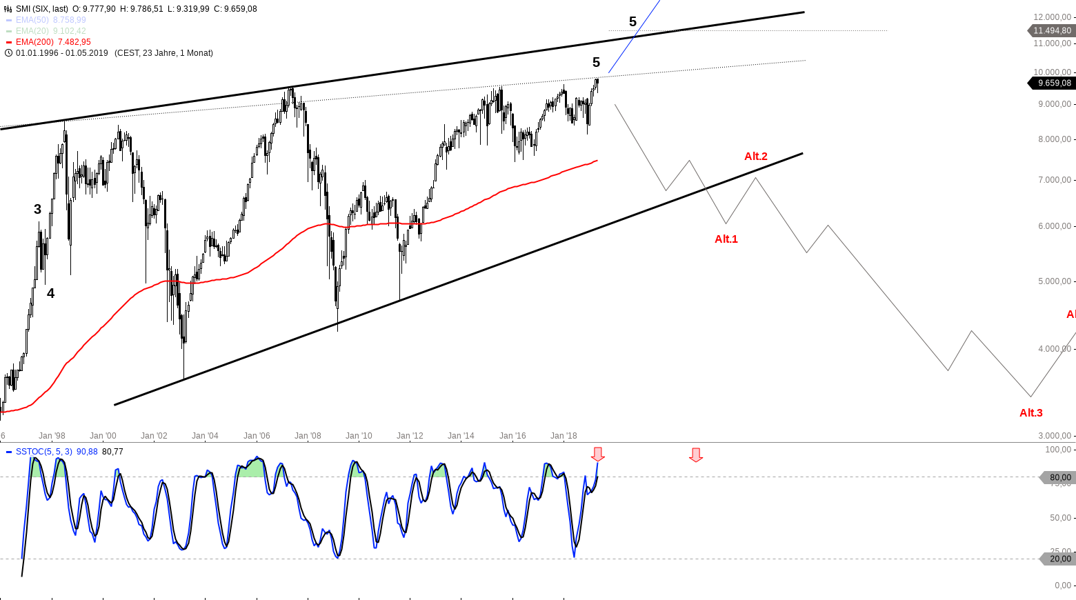 Monatschart SMI Index 1996 – 2019, eine Kerze entspricht einem Monat – Chart by Guidants.