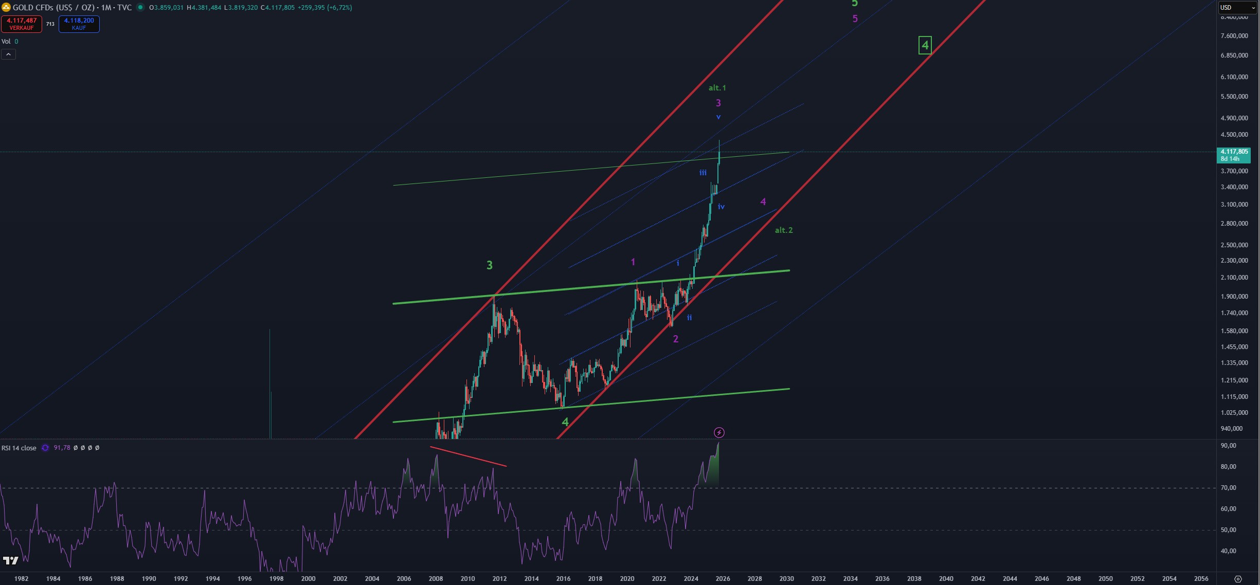 - Ev. gibt es noch eine interne Welle v nach oben, Richtung 4500, um die violette 3, im blauen Trendkanal zu beenden. Und dann erst kommt die Korrektur. Oder wir bleiben jetzt direkt in der Korrektur.