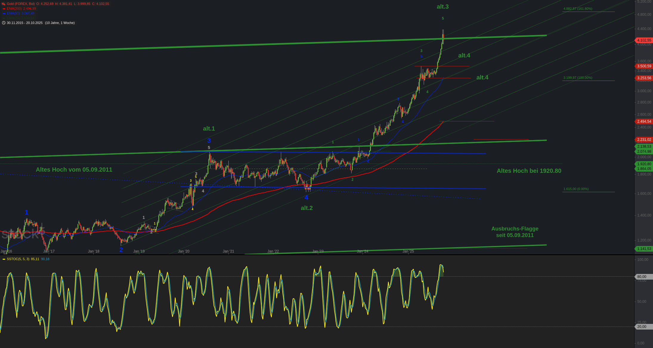 Wochenchart Gold 2016 – 2025, eine Kerze entspricht einer Woche / Logarithmisch – Chart Stock3.