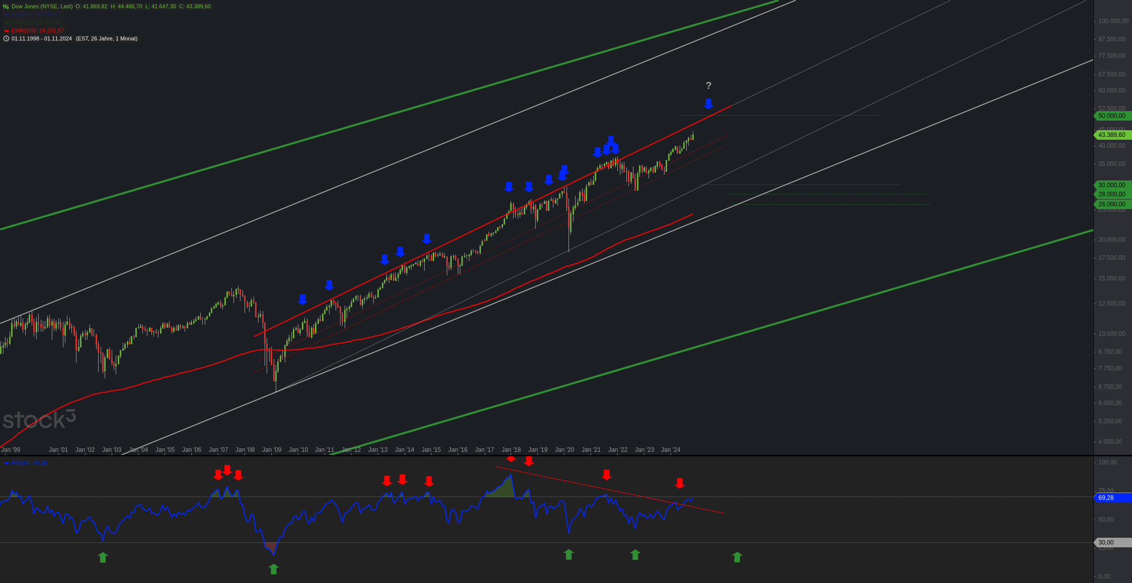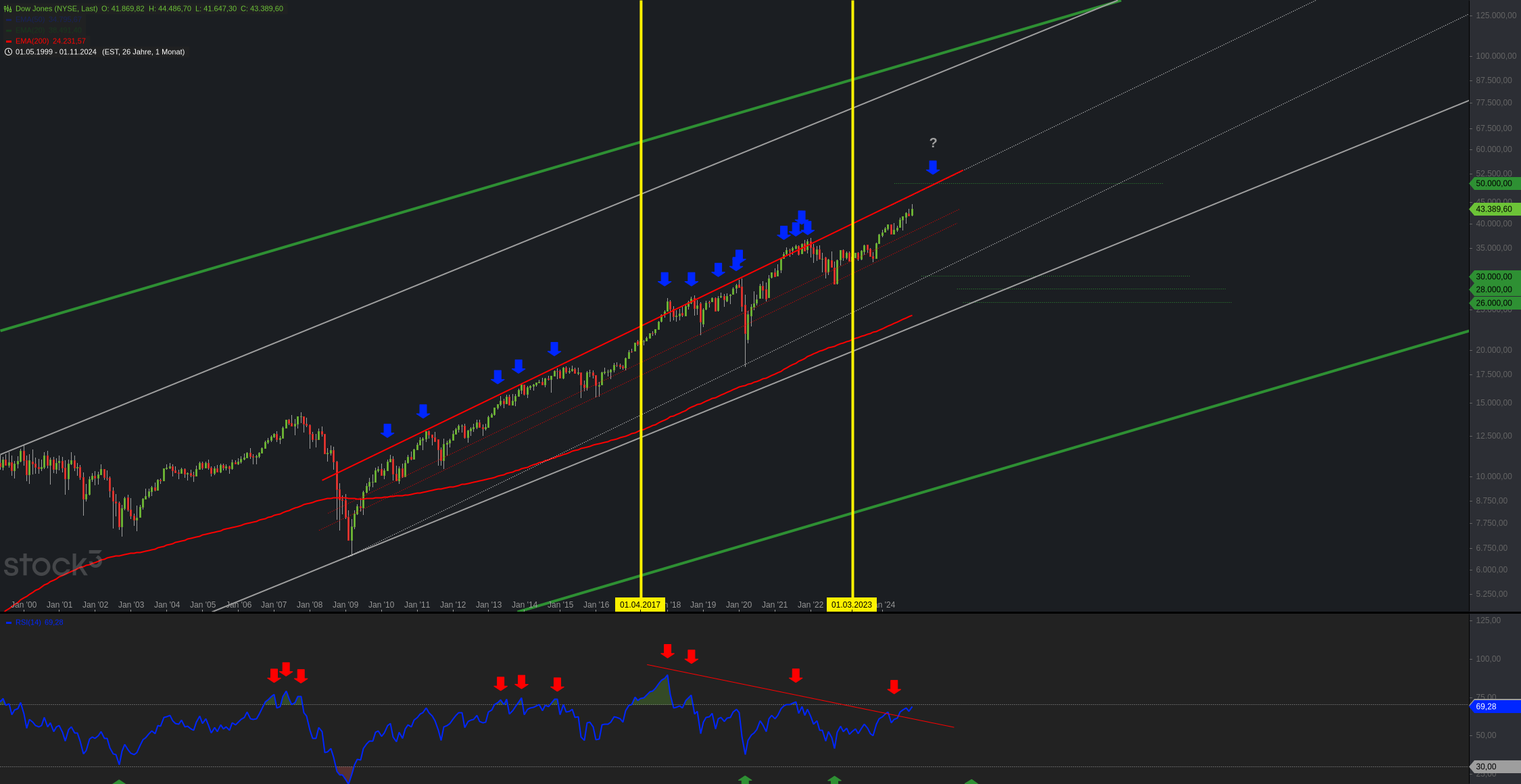 Monatschart Dow Jones Index 1990 – 2024, eine Kerze entspricht einem Monat – Chart Stock3.