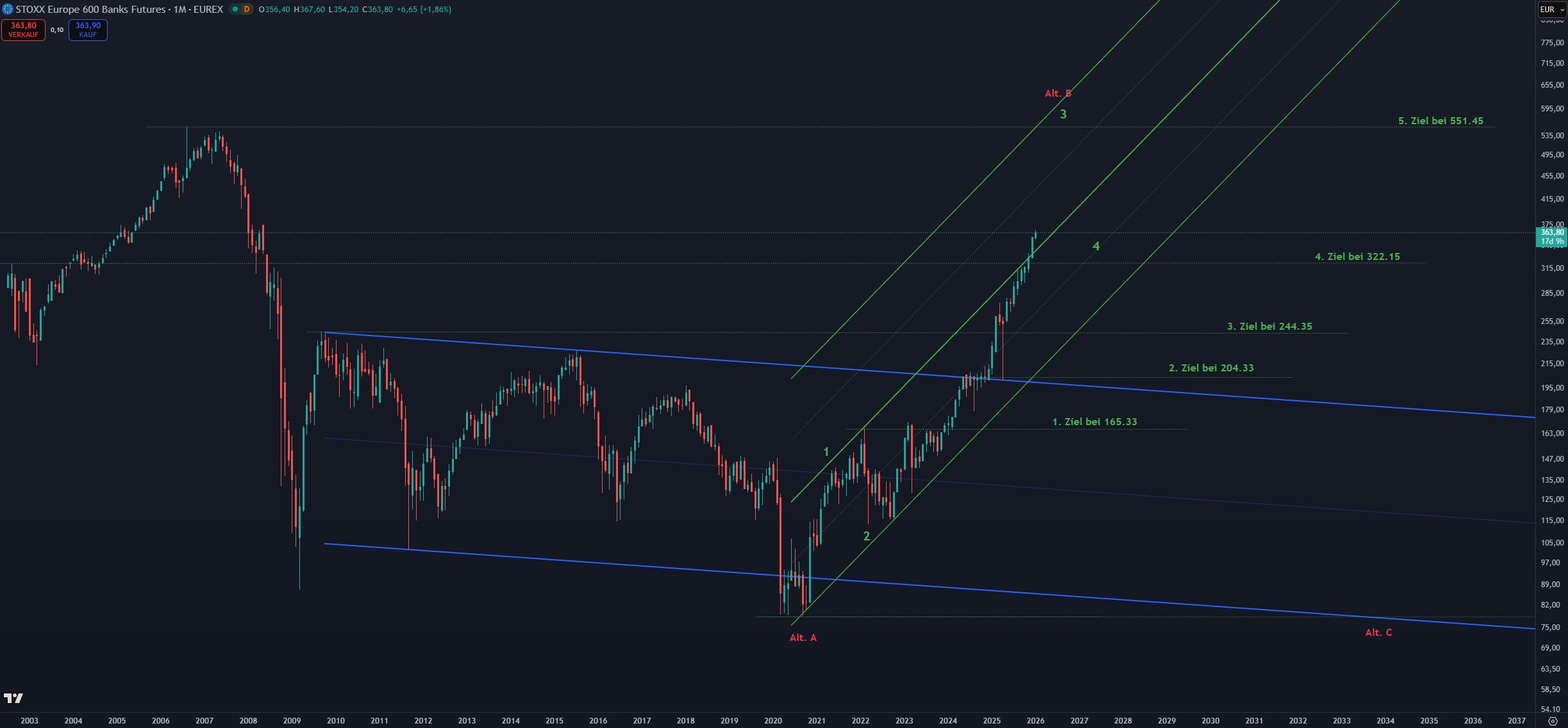 Wir können nach Überwinden des blauen Abwärtstrends davon ausgehen, einen längerfristigen Aufwärtstrend bei den Banken zu haben. Natürlich bleibt noch das alte Hoch bei 551.45, das überwunden werden muss. Solange bleibt die korrektive Alternative bestehen.