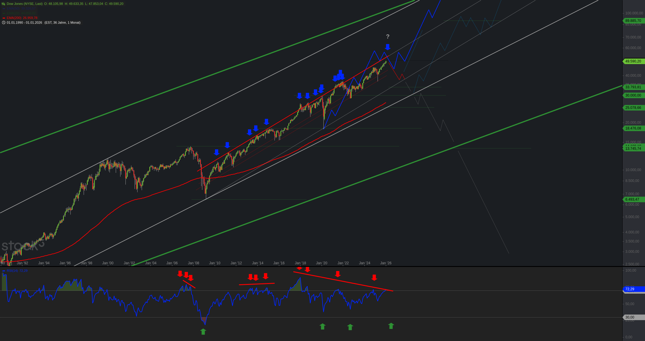 Monatschart Dow Jones Index 1990 – 2026, eine Kerze entspricht einem Monat / Logarithmisch – Chart Stock3.
