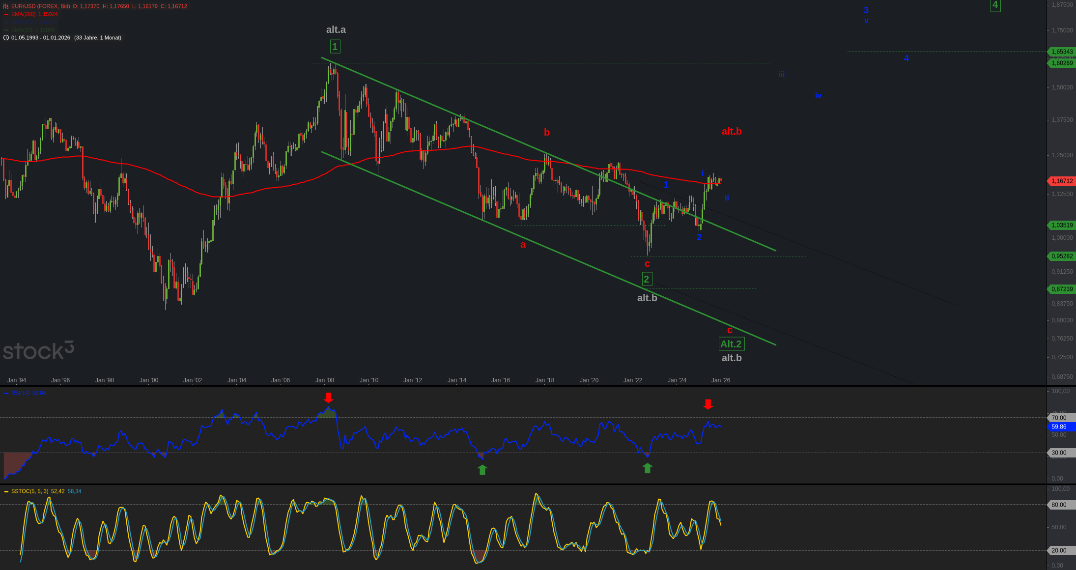 Monatschart EUR_USD 1993 – 2026, eine Kerze entspricht einem Monat / Logarithmisch – Chart Stock3.