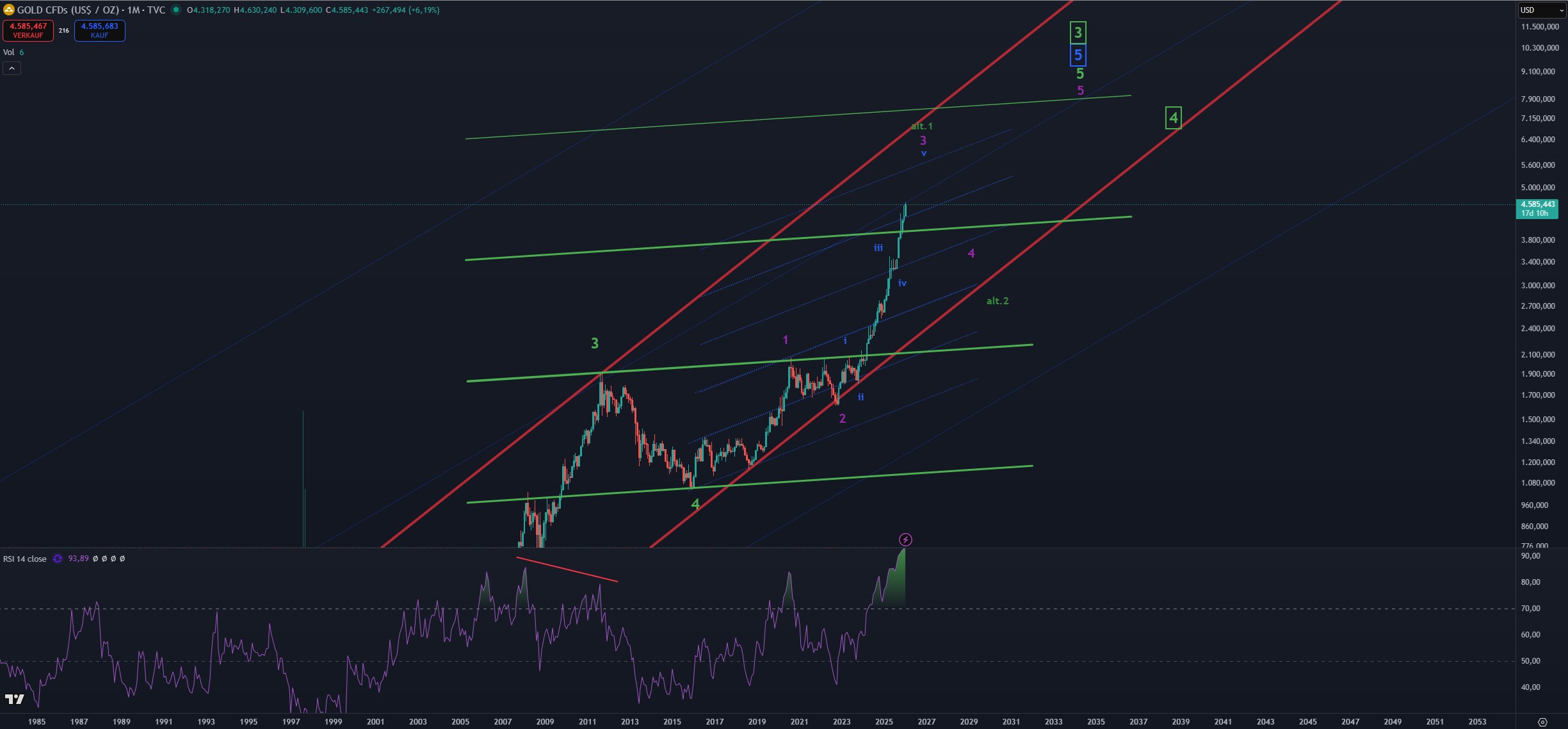 Monatschart Gold 1990 – 2026, eine Kerze entspricht einem Monat / Logarithmisch – Chart TradingView.