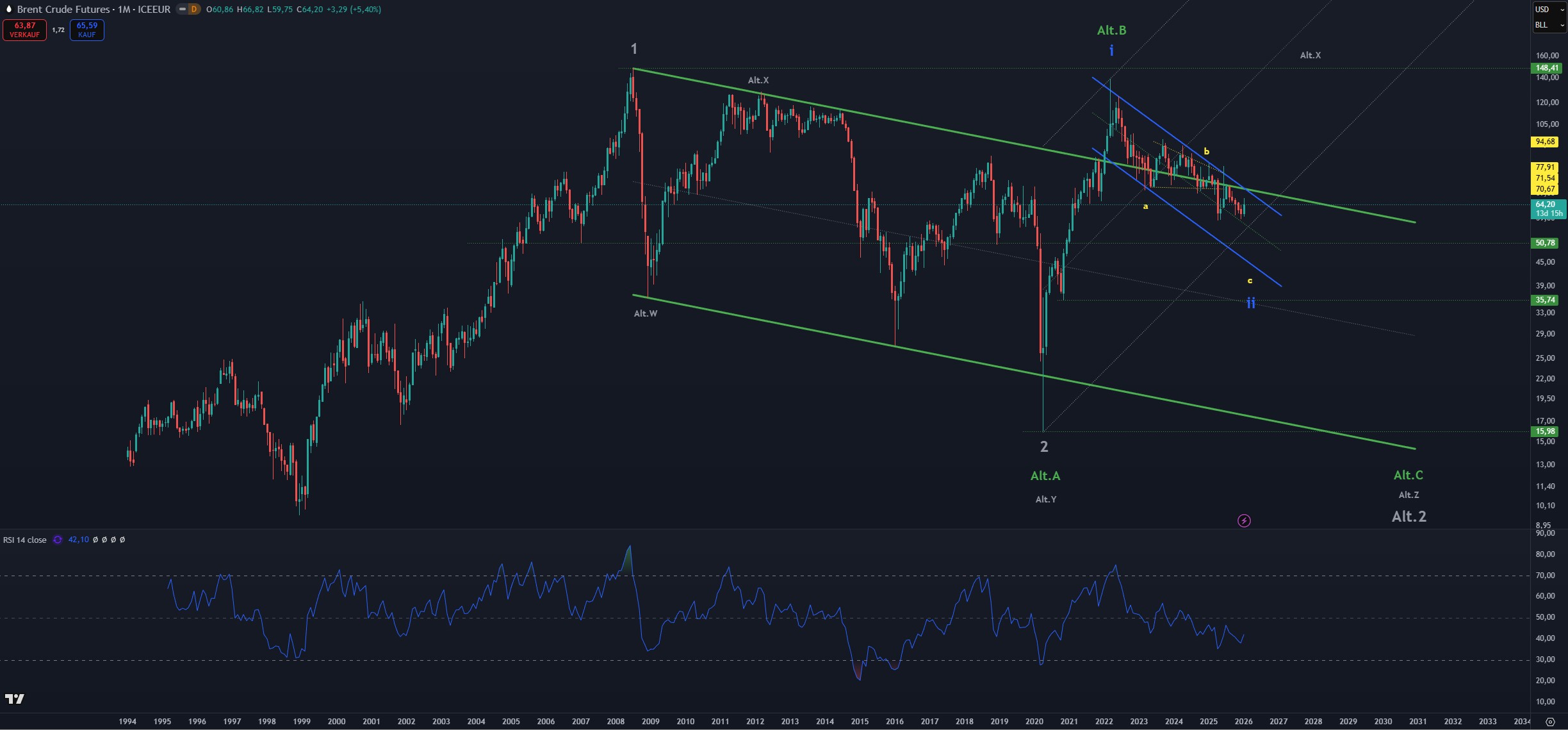 Fakt: Brent Oel ist noch immer im langfristigen Abwärtstrend gefangen. Die 50 USD nach unten sind möglich. Das nächste Ziel nach oben, liegt danach bei 148.41 USD, dem alten Hoch aus dem Jahre 2008. Danach dürfte es über die 200 USD gehen.