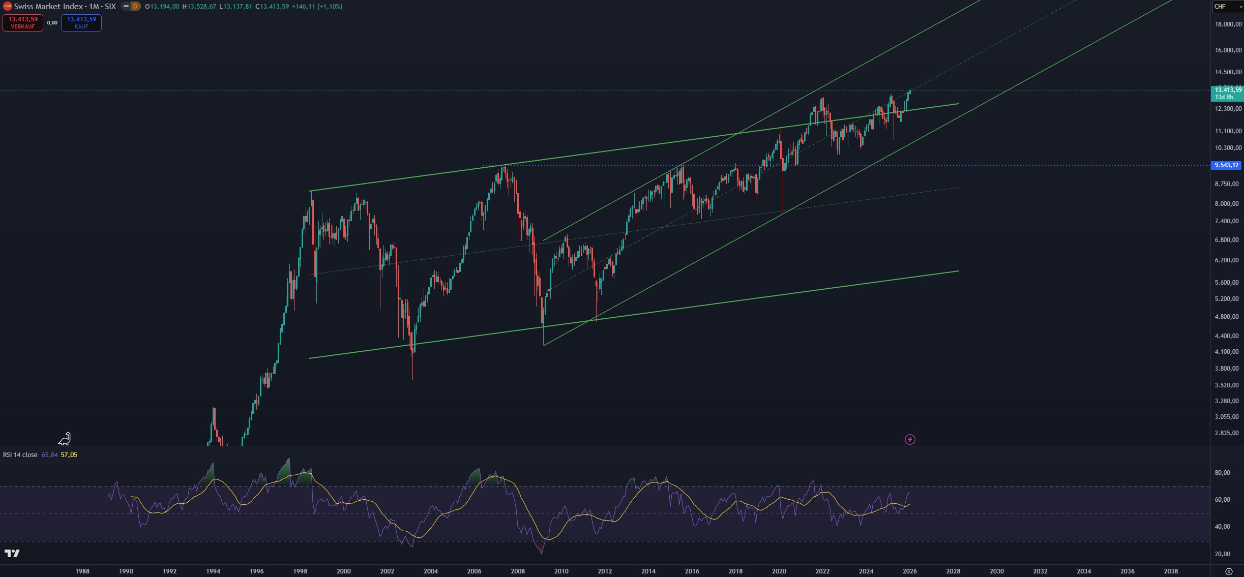 Monatschart SMI Index 1993 – 2026, eine Kerze entspricht einem Monat / Logarithmisch – Chart TradingView.