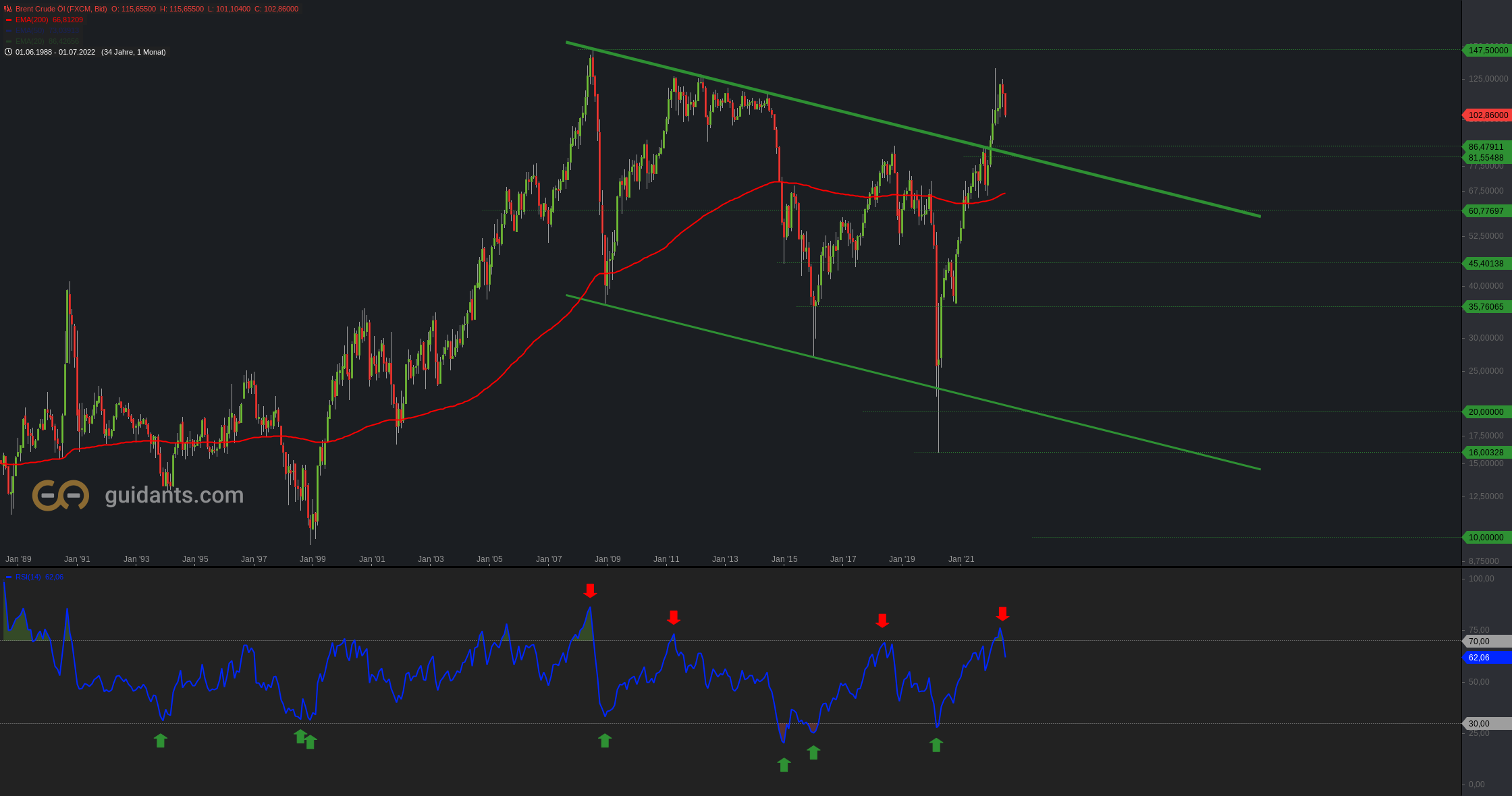 Monatschart Brent Crude Oil 1988 – 2022, eine Kerze entspricht einem Monat / Logarithmisch – Chart by Guidants.