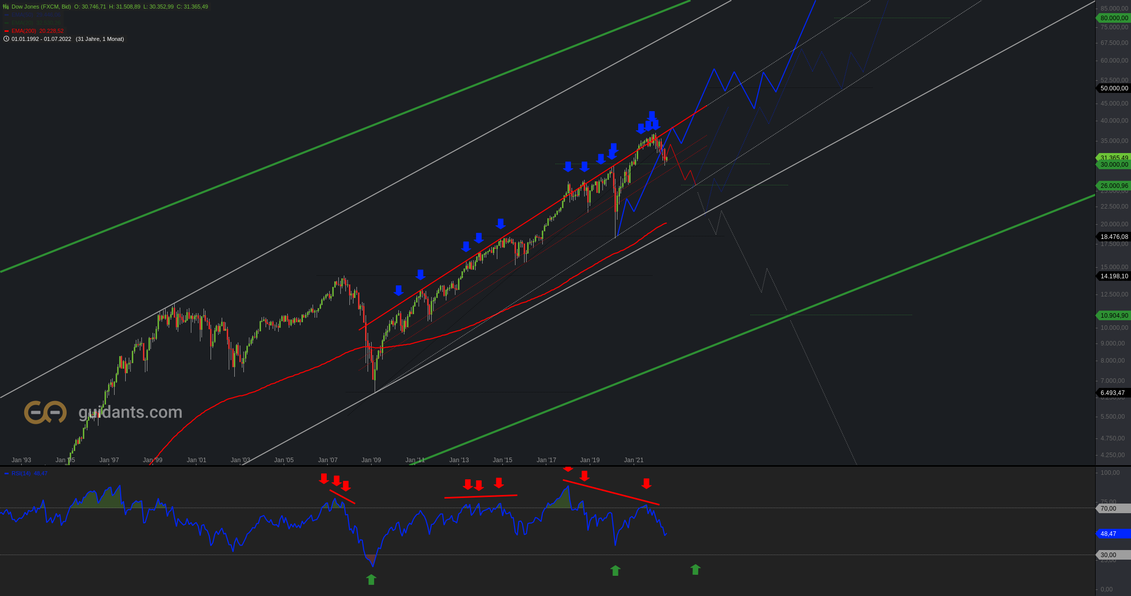 Monatschart Dow Jones Index 1992 – 2022, eine Kerze entspricht einem Monat / Logarithmisch – Chart by Guidants.