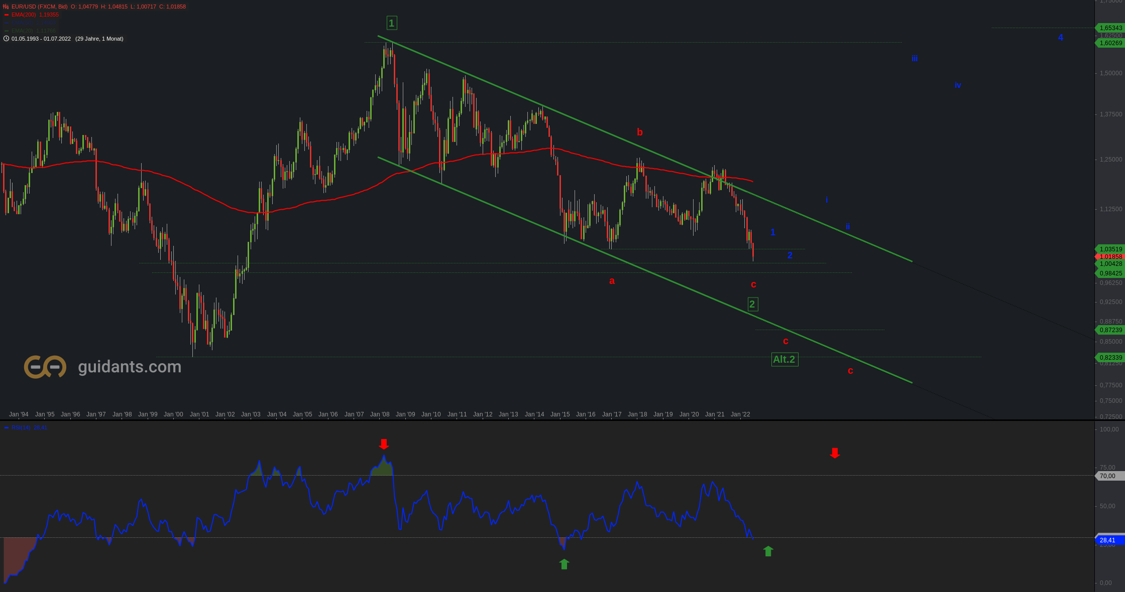 Monatschart EUR_USD 1993 – 2022, eine Kerze entspricht einem Monat / Logarithmisch – Chart by Guidants.