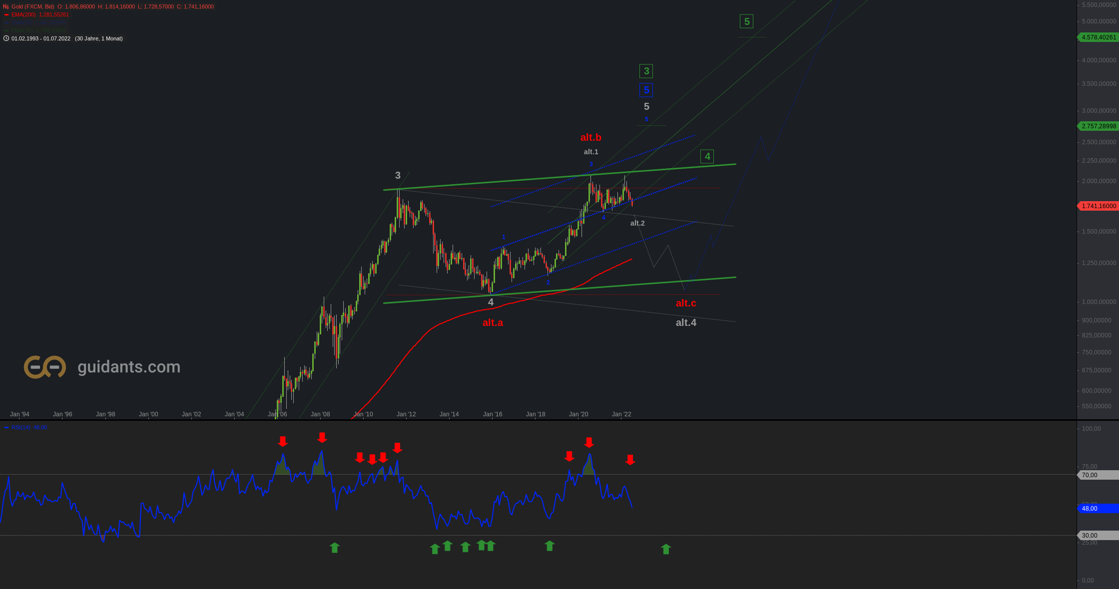 Monatschart Gold 1993 – 2022, eine Kerze entspricht einem Monat / Logarithmisch – Chart by Guidants