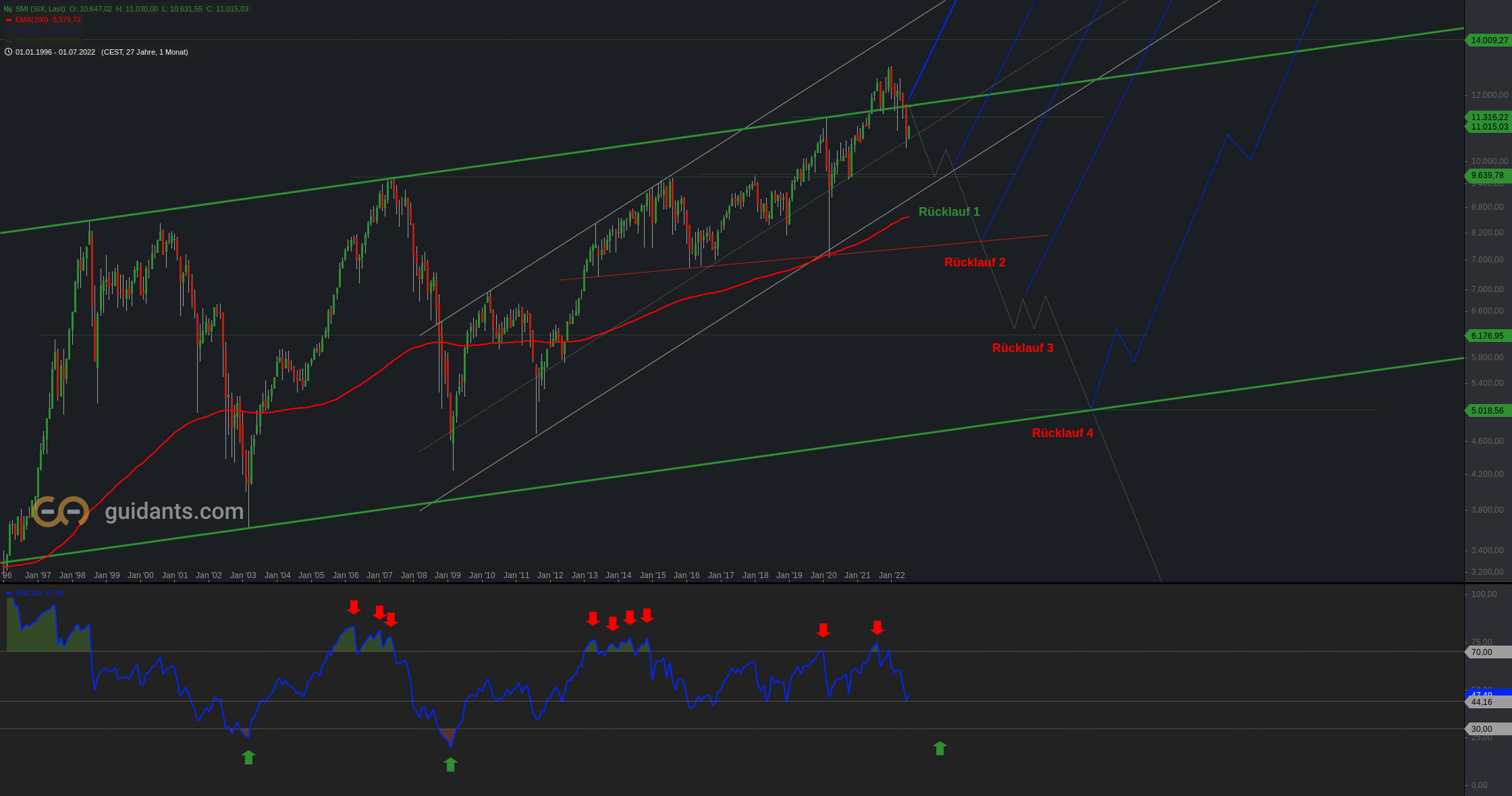 Monatschart SMI Index 1996 – 2022, eine Kerze entspricht einem Monat / Logarithmisch – Chart by Guidants.
