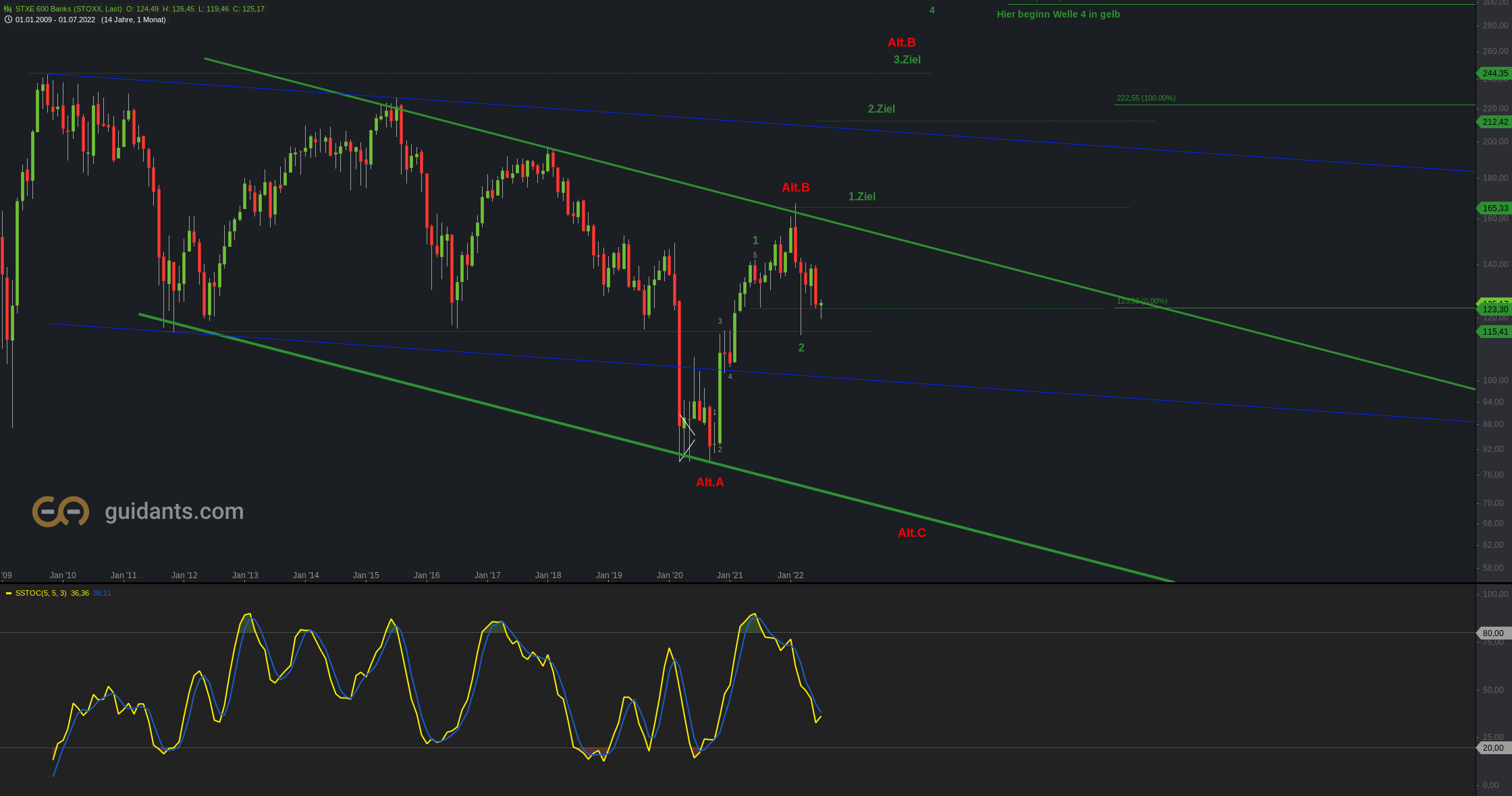 - EuroStoxxBanks: An oberen Trendkanallinie bei 165 EUR, am Ziel 1, angekommen. Konsolidiert. Auf dem Weg Richtung 212/244 EUR.