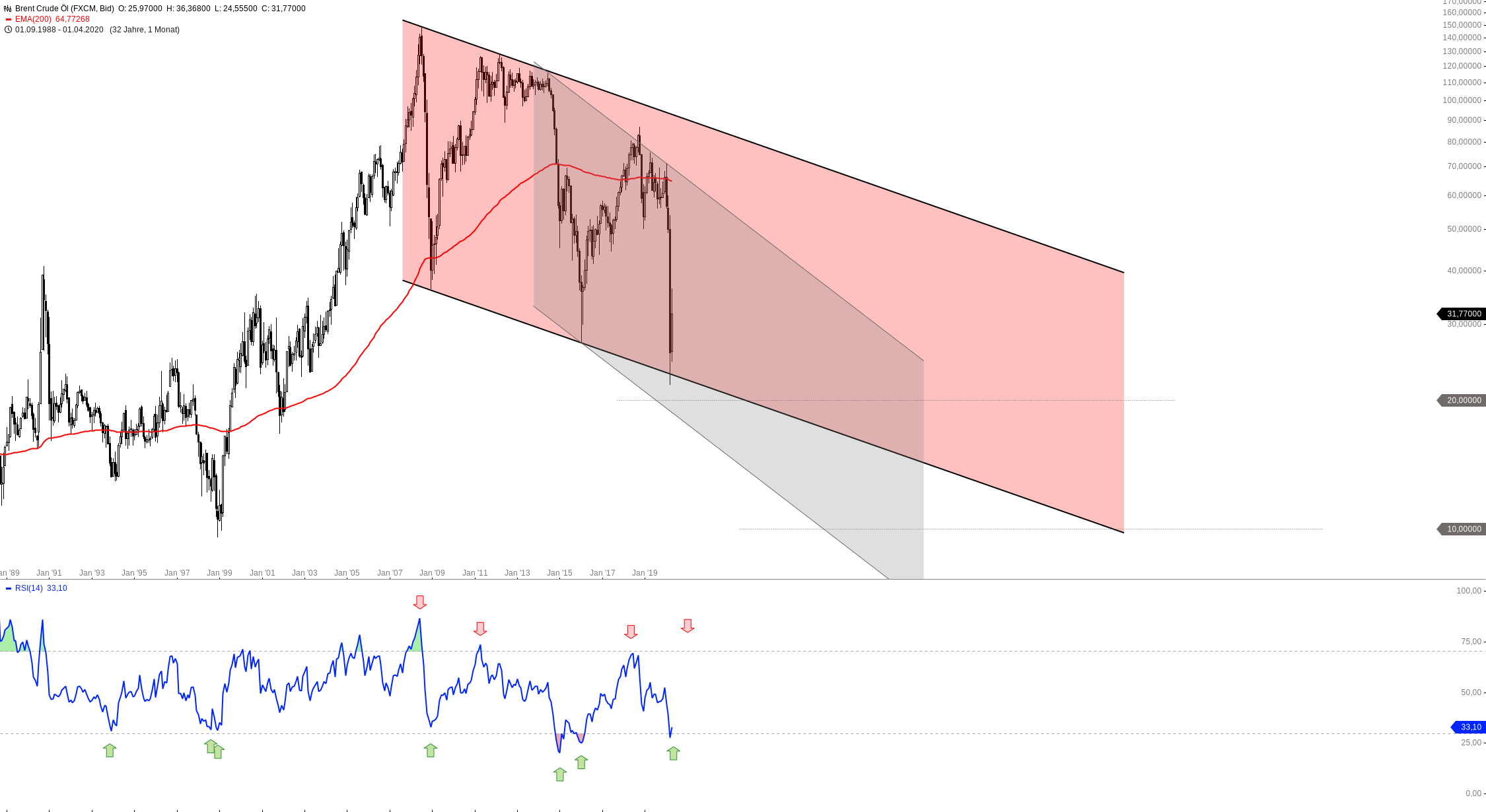 Monatschart Brent Crude Oil 1988 – 2020, eine Kerze entspricht einem Monat – Chart by Guidants.