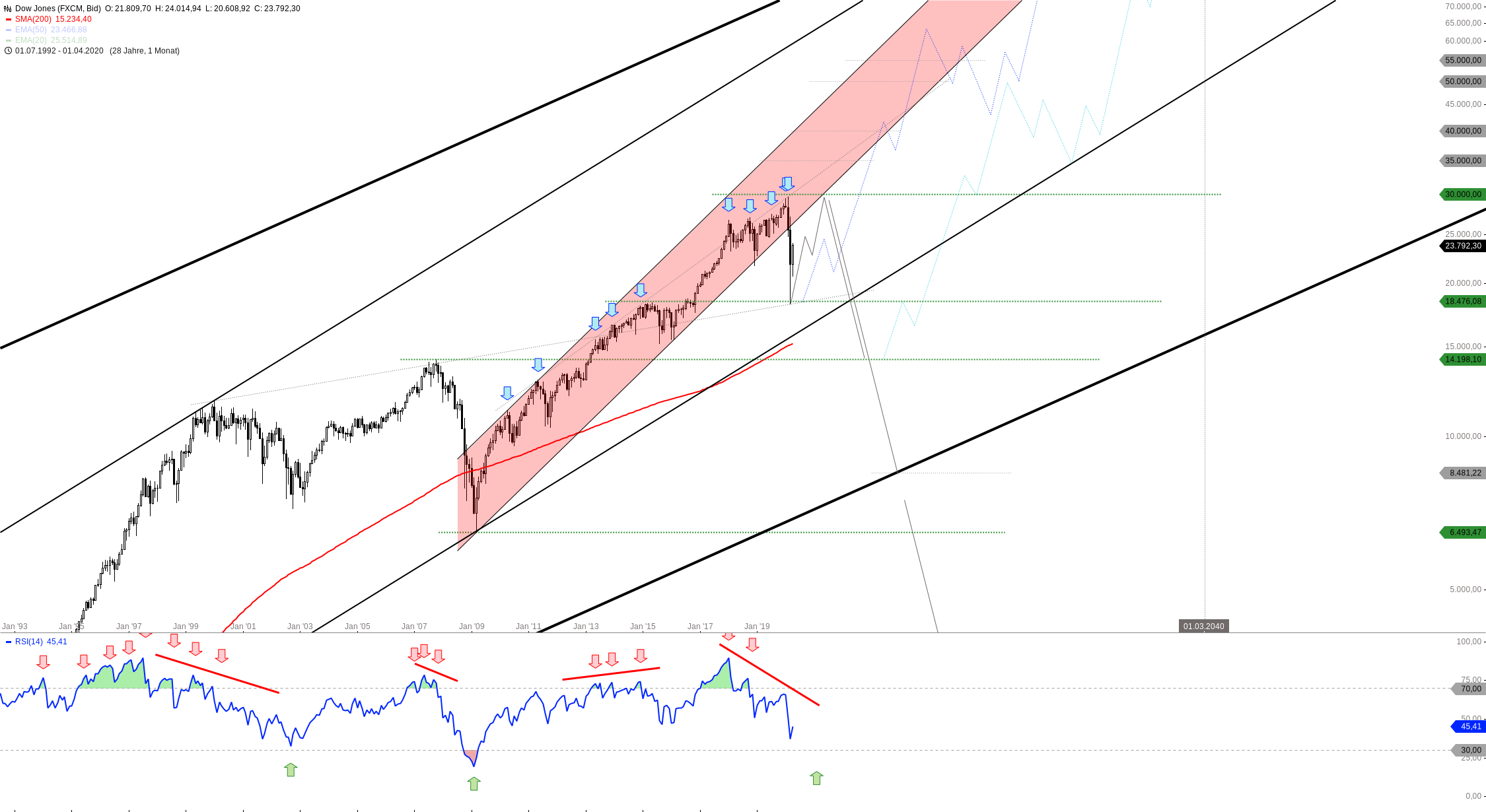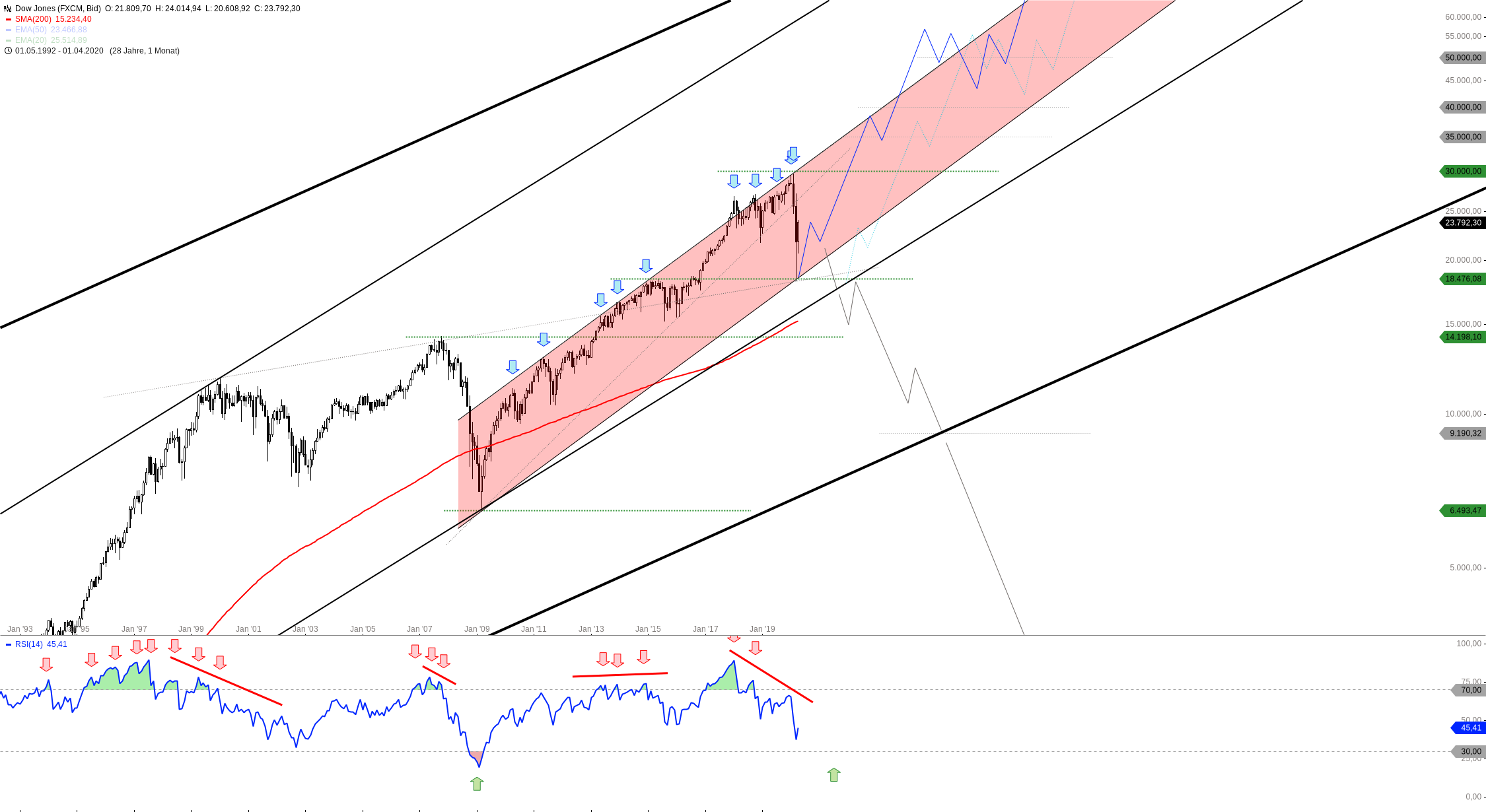 Monatschart Dow Jones Index 1992 – 2020, eine Kerze entspricht einem Monat – Chart by Guidants.