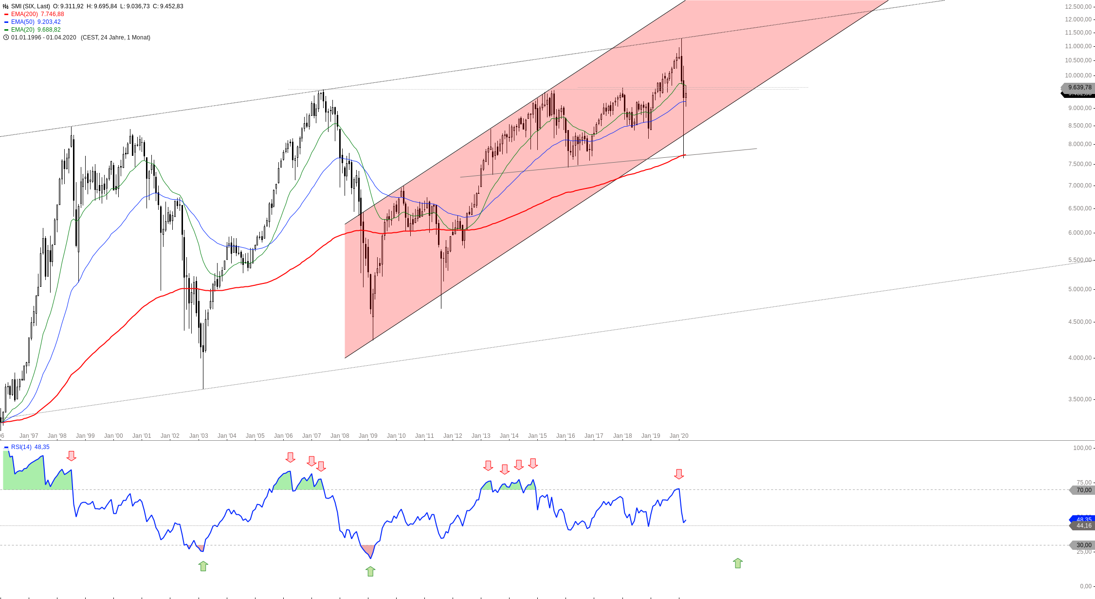 Monatschart SMI Index 1996 – 2020, eine Kerze entspricht einem Monat – Chart by Guidants.