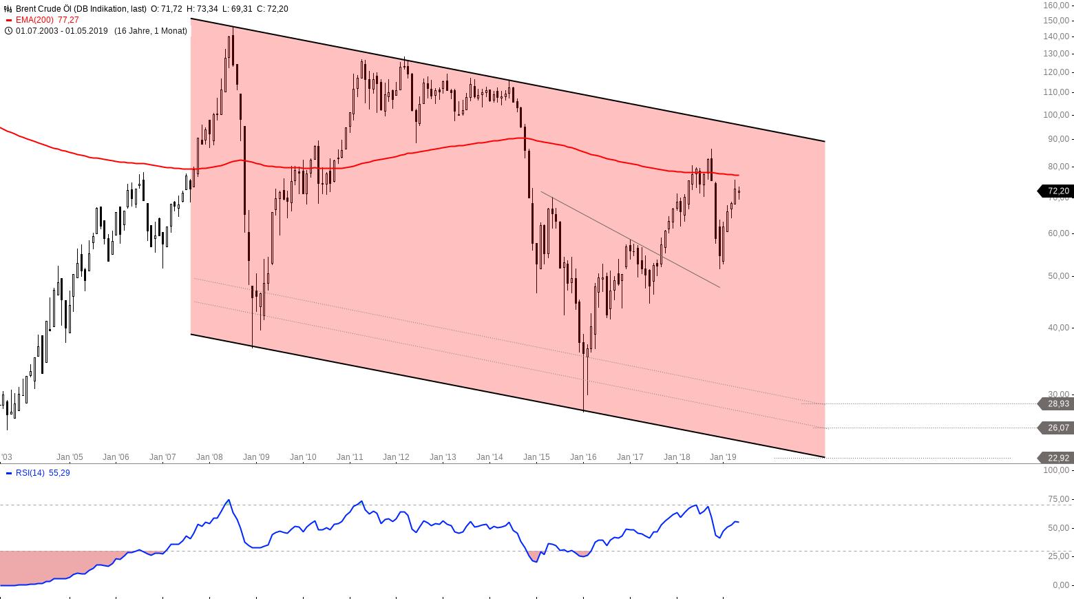 Monatschart Brent Crude Oil 2003 – 2019, eine Kerze entspricht einem Monat – Chart by Guidants.