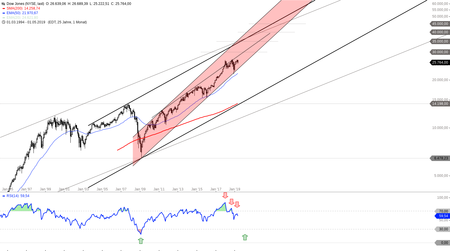 Monatschart Dow Jones Index 1995 – 2019, eine Kerze entspricht einem Monat – Chart by Guidants.