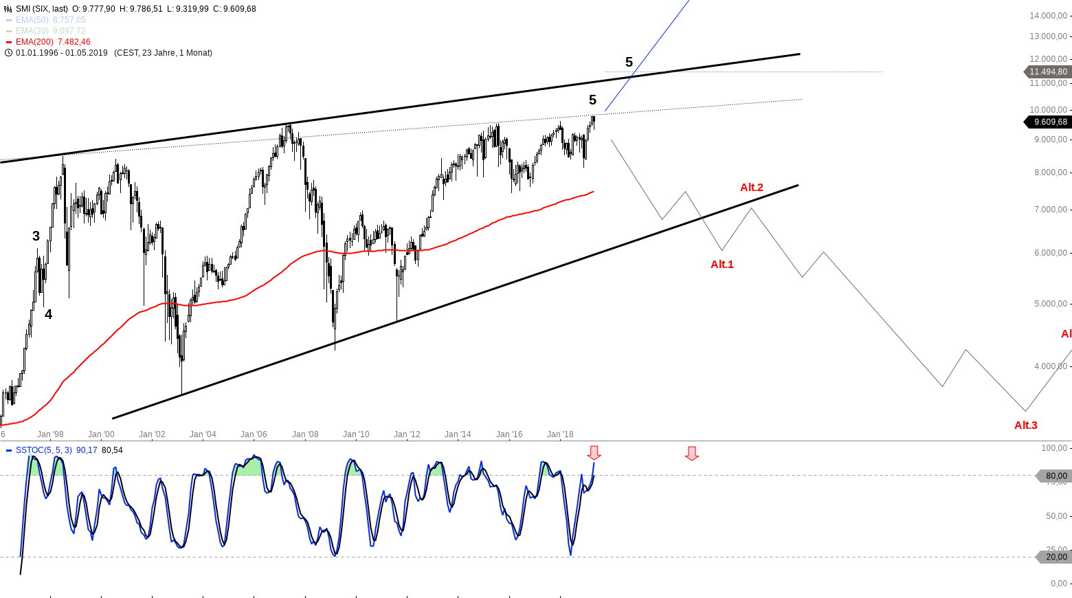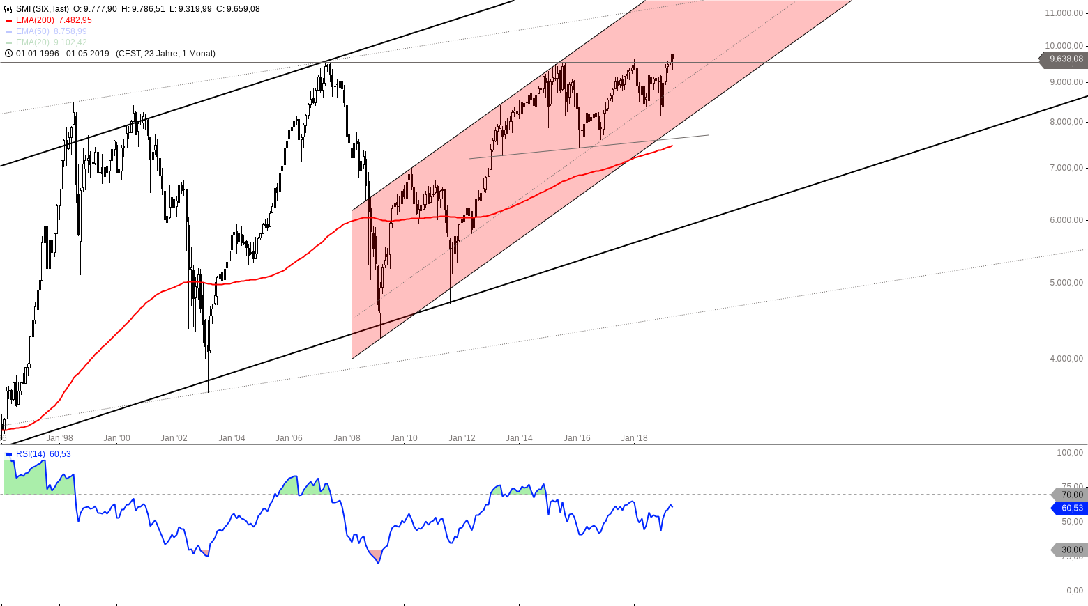 Monatschart SMI Index 1996 – 2019, eine Kerze entspricht einem Monat – Chart by Guidants.