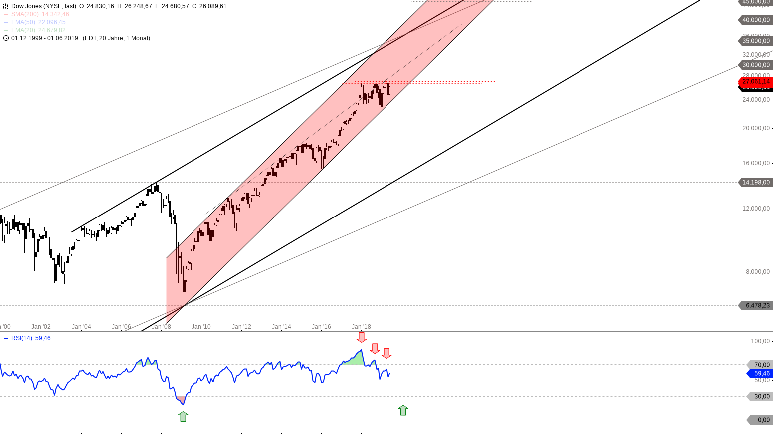 Monatschart Dow Jones Index 2000 – 2019, eine Kerze entspricht einem Monat – Chart by Guidants.