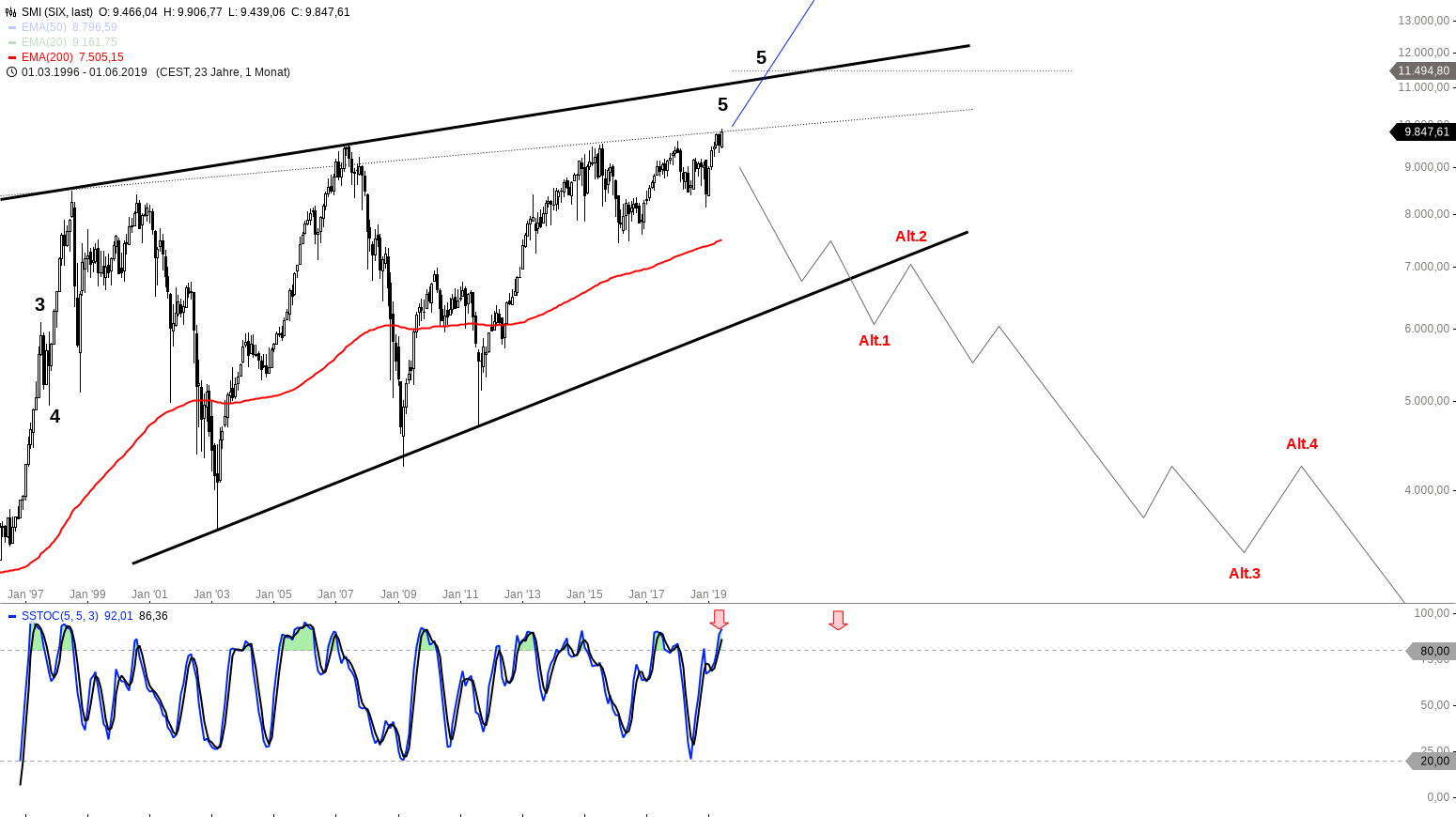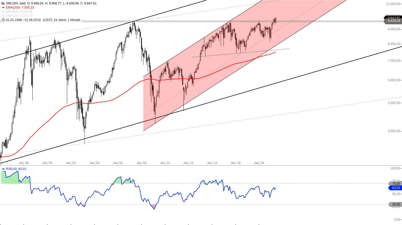 Monatschart SMI Index 1996 – 2019, eine Kerze entspricht einem Monat – Chart by Guidants.