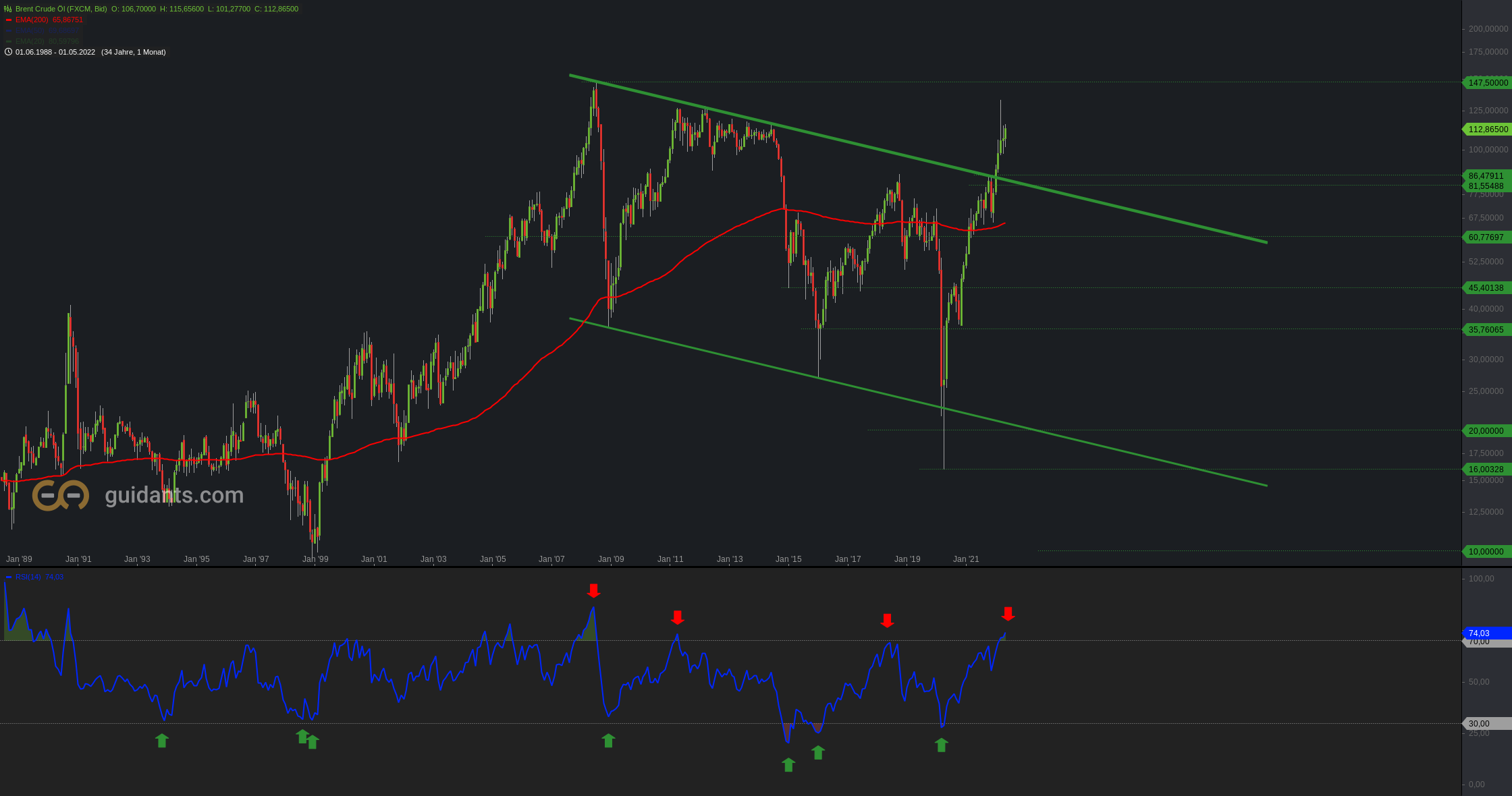 Monatschart Brent Crude Oil 1988 – 2022, eine Kerze entspricht einem Monat / Logarithmisch – Chart by Guidants.