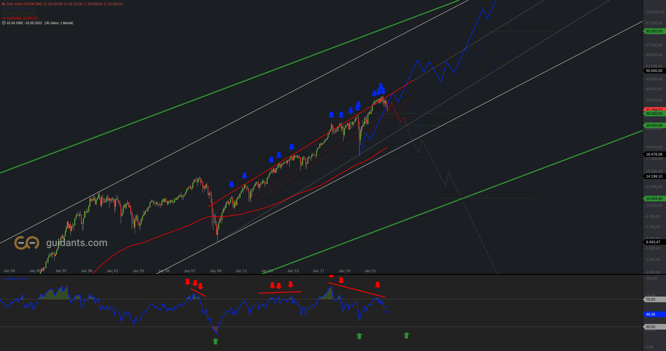 Monatschart Dow Jones Index 1993 – 2022, eine Kerze entspricht einem Monat / Logarithmisch – Chart by Guidants.