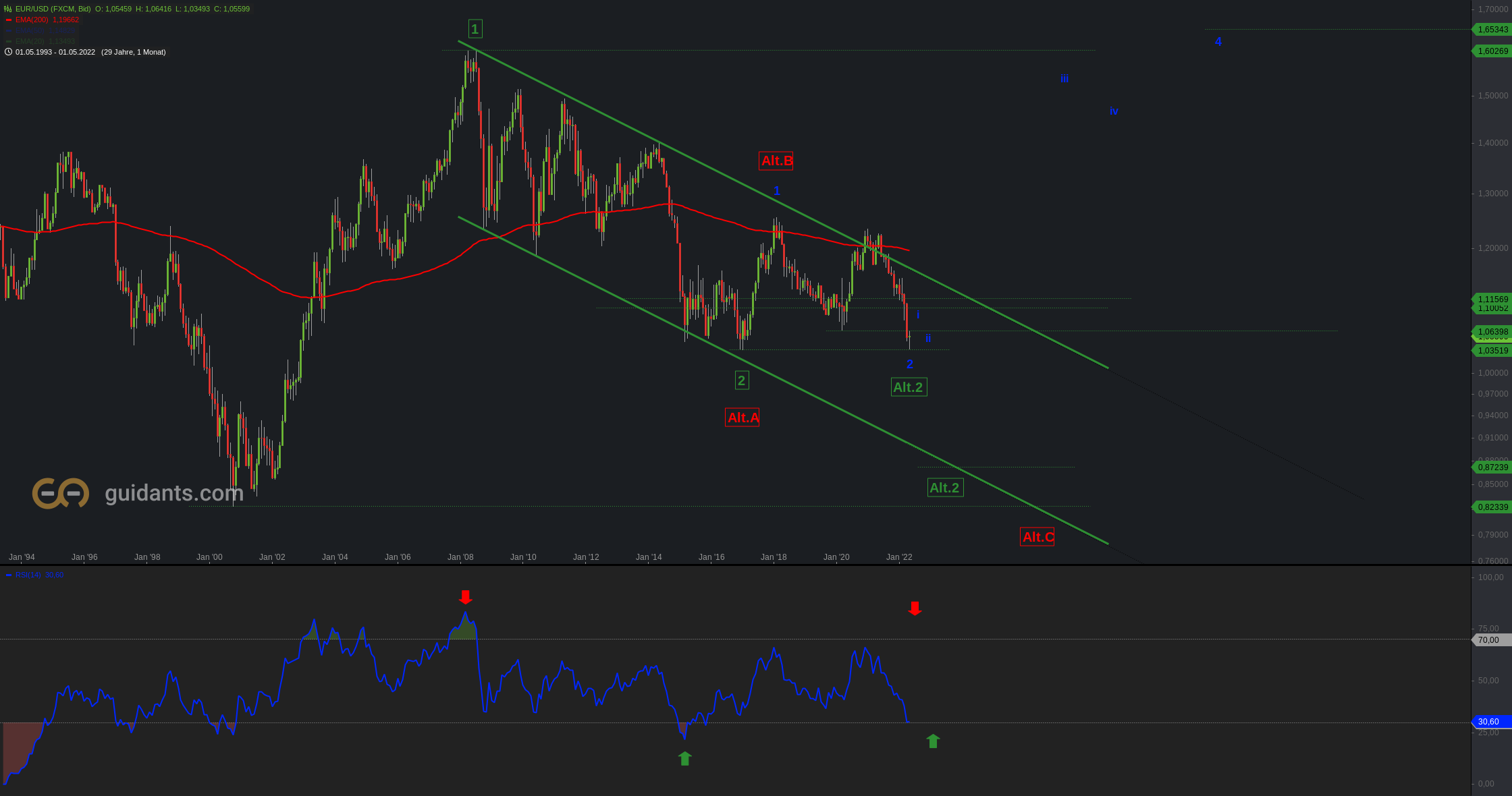 Monatschart EUR_USD 1993 – 2022, eine Kerze entspricht einem Monat / Logarithmisch – Chart by Guidants.