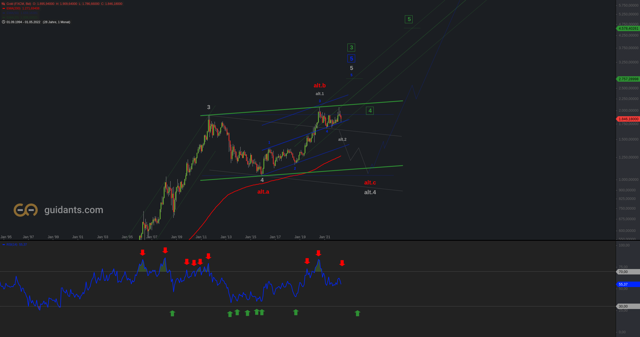 Monatschart Gold 1995 – 2022, eine Kerze entspricht einem Monat / Logarithmisch – Chart by Guidants