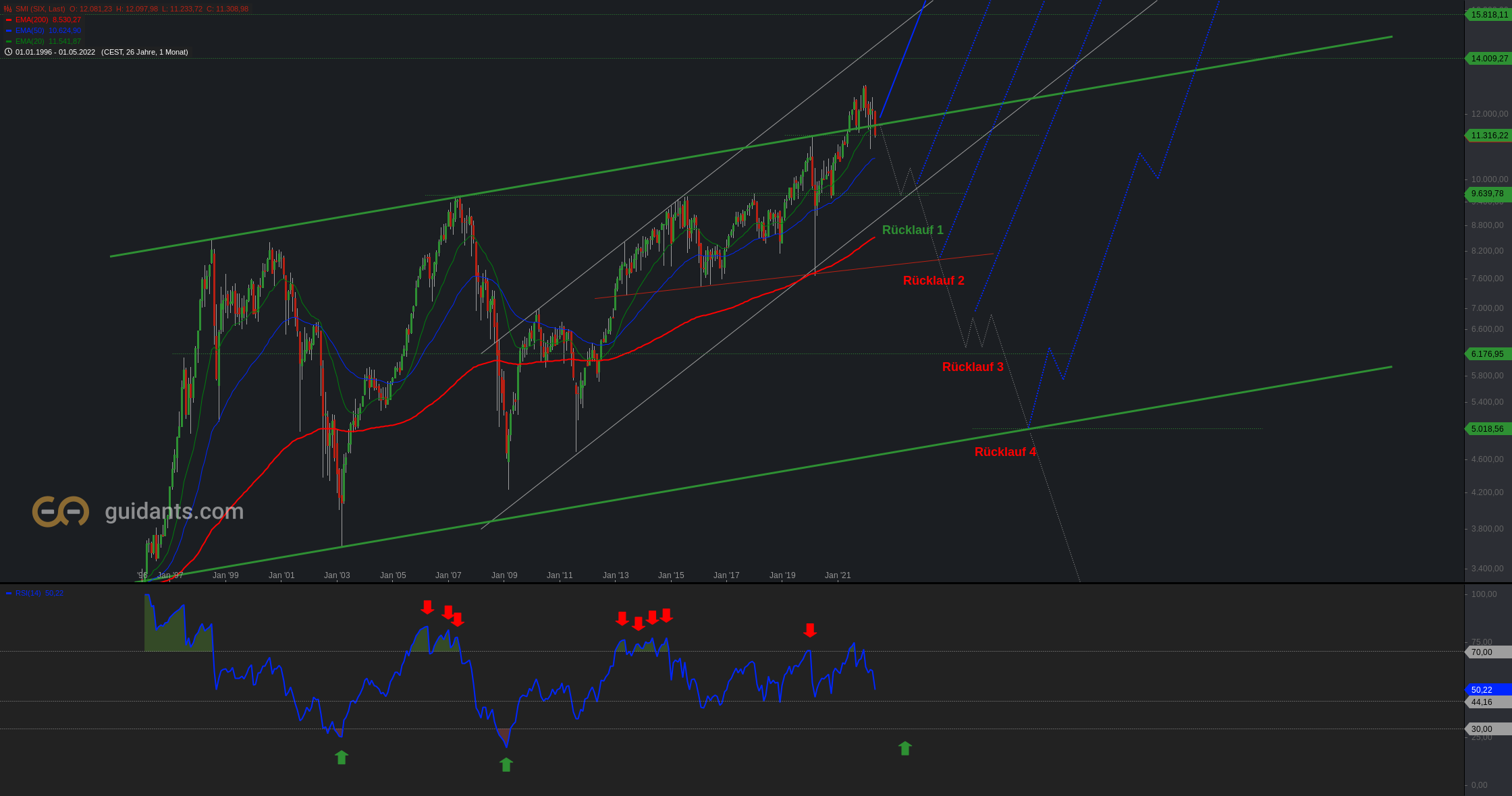 Monatschart SMI Index 1996 – 2022, eine Kerze entspricht einem Monat / Logarithmisch – Chart by Guidants.