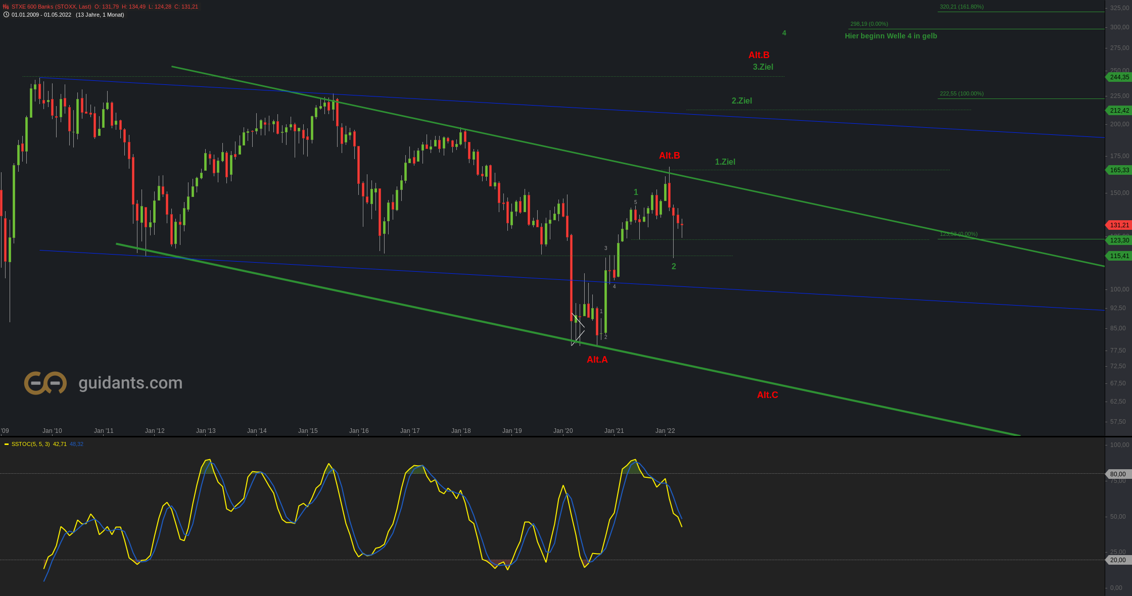 Monatschart STXE 600 Bank Index Index 2009 – 2022, eine Kerze entspricht einem Monat / Logarithmisch – Chart by Guidants.