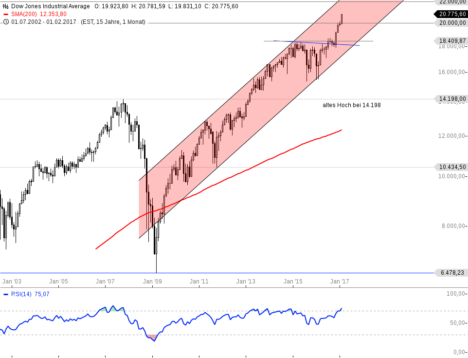 Monatschart Dow Jones Index 2003 – 2017, eine Kerze entspricht einem Monat – Chart by GodmodeTrader / Guidants