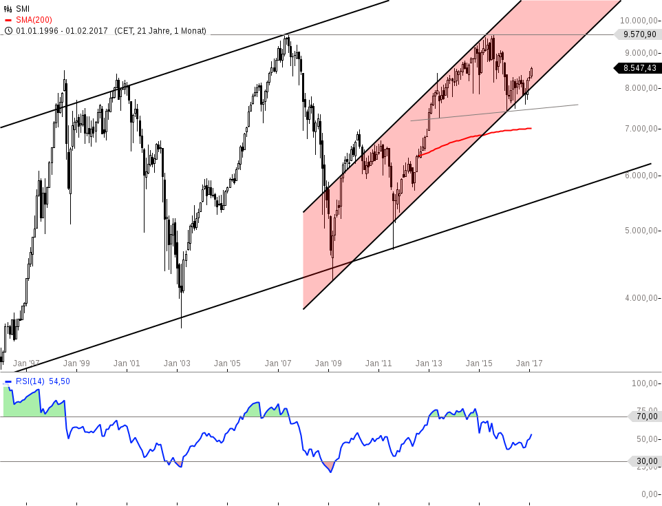 Monatschart SMI Index 1997 – 2017, eine Kerze entspricht einem Monat – Chart by GodmodeTrader / Guidants