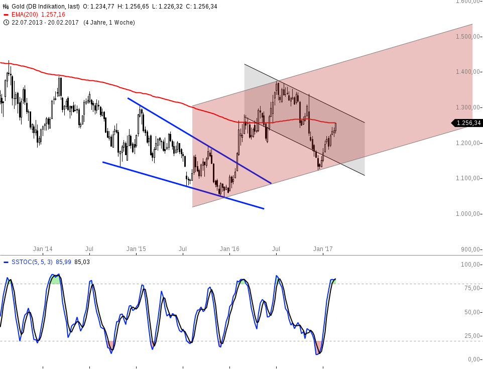 Wochenchart Gold 2013 – 2017, eine Kerze entspricht einer Woche – Chart by GodmodeTrader / Guidants
