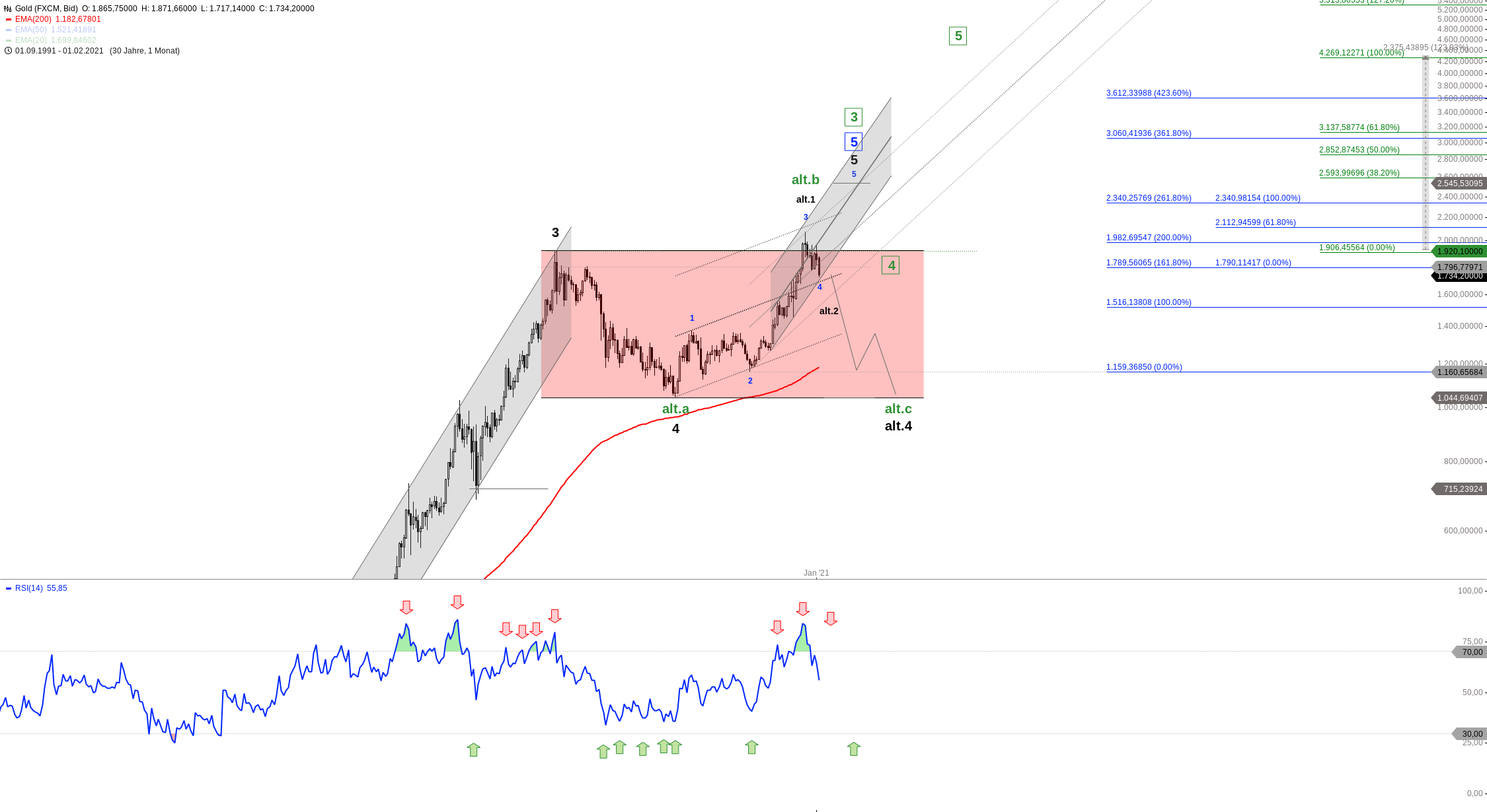 Wird die Region von 1920 USD – das ist das alte Hoch und gleichzeitig die Oberkante der Seitwärtsbewegung – nachhaltig überwunden, dann nimmt Gold wieder Fahrt auf. Und es wird ein impulsiver Ausbruch und der Beginn einer nachhaltigen 1-2-3-4-5 Wellen-Sequenz, die die letzte impulsive Welle 5, der 3 (Richtung 2’500 USD), der 3-4-5 Wellensequenz in den – vorerst – 4500er Bereich gestaltet. Dazu müssten wir jetzt Welle 4 bei 1667 USD, bestätigen. 5er-Wellen in Edelmetallen extendieren zum Teil sehr stark.