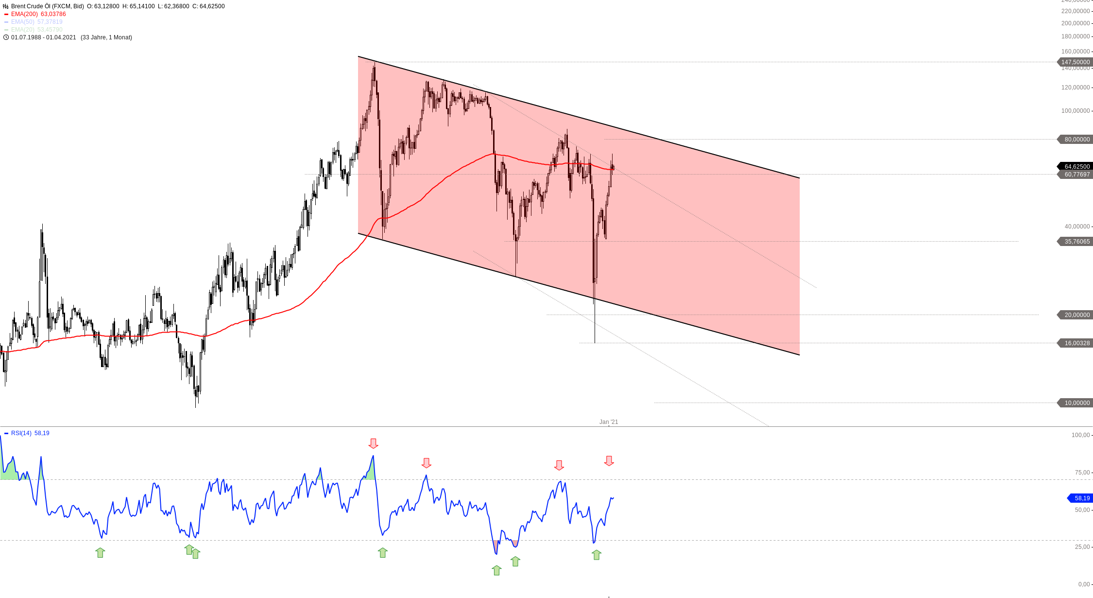 Monatschart Brent Crude Oil 1988 – 2021, eine Kerze entspricht einem Monat / Logarithmisch – Chart by Guidants.