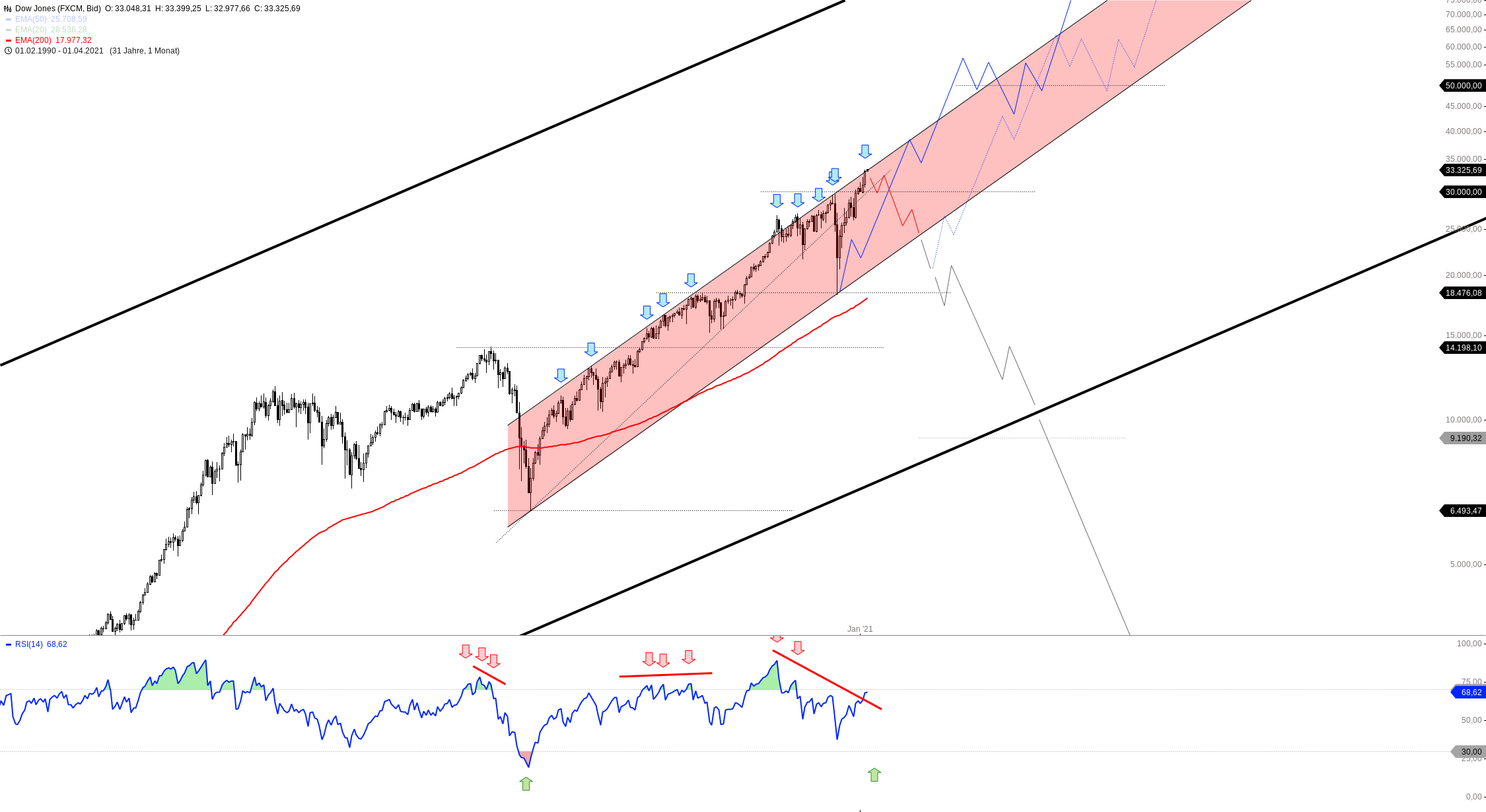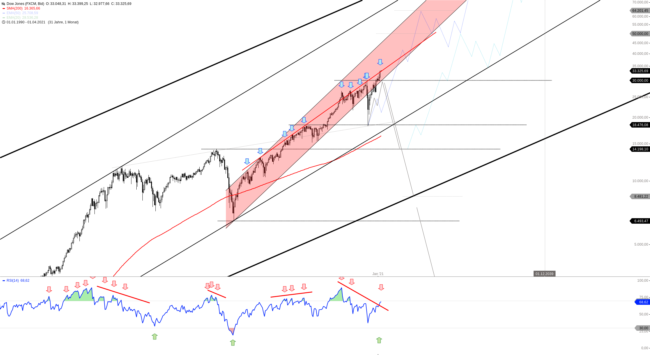 Monatschart Dow Jones Index 1990 – 2021, eine Kerze entspricht einem Monat / Logarithmisch – Chart by Guidants.
