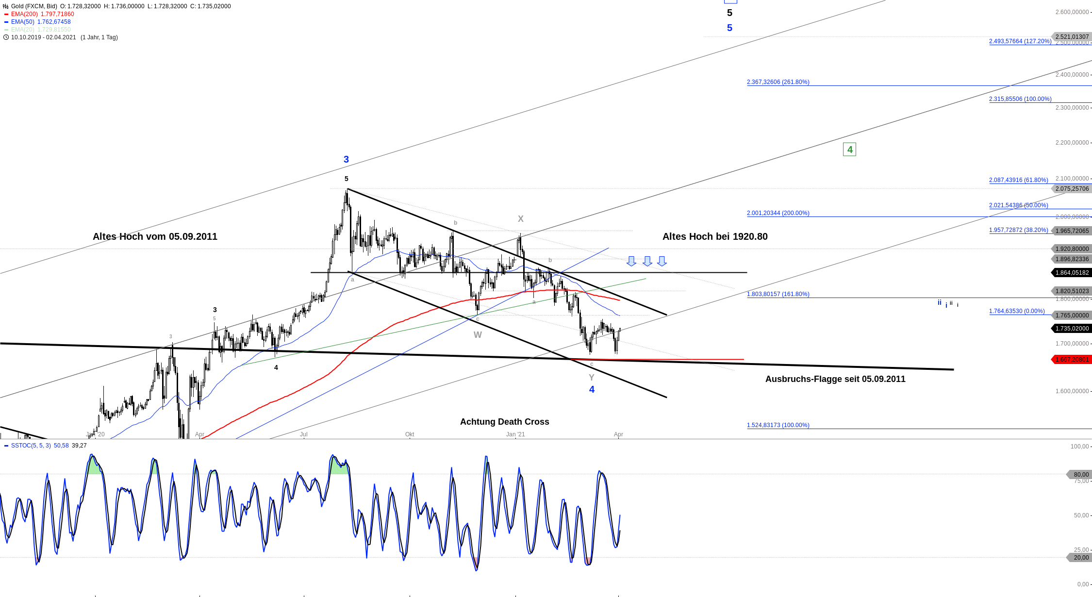 Tageschart Gold Okt. 19 – April 21, eine Kerze entspricht einem Tag / Logarithmisch – Chart by Guidants