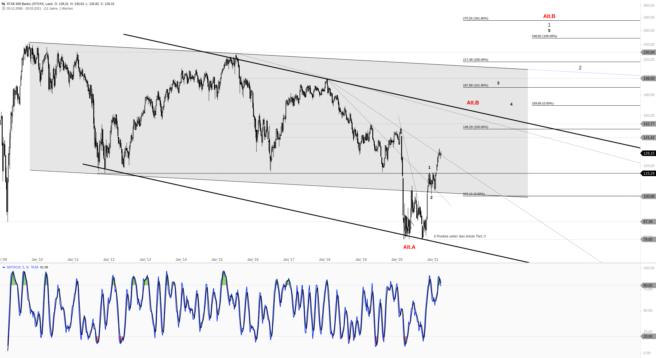 Wochenchart STXE 600 Bank Index Index Feb. 2009 – Deb. 2021, eine Kerze entspricht einer Woche / Logarithmisch – Chart by Guidants.