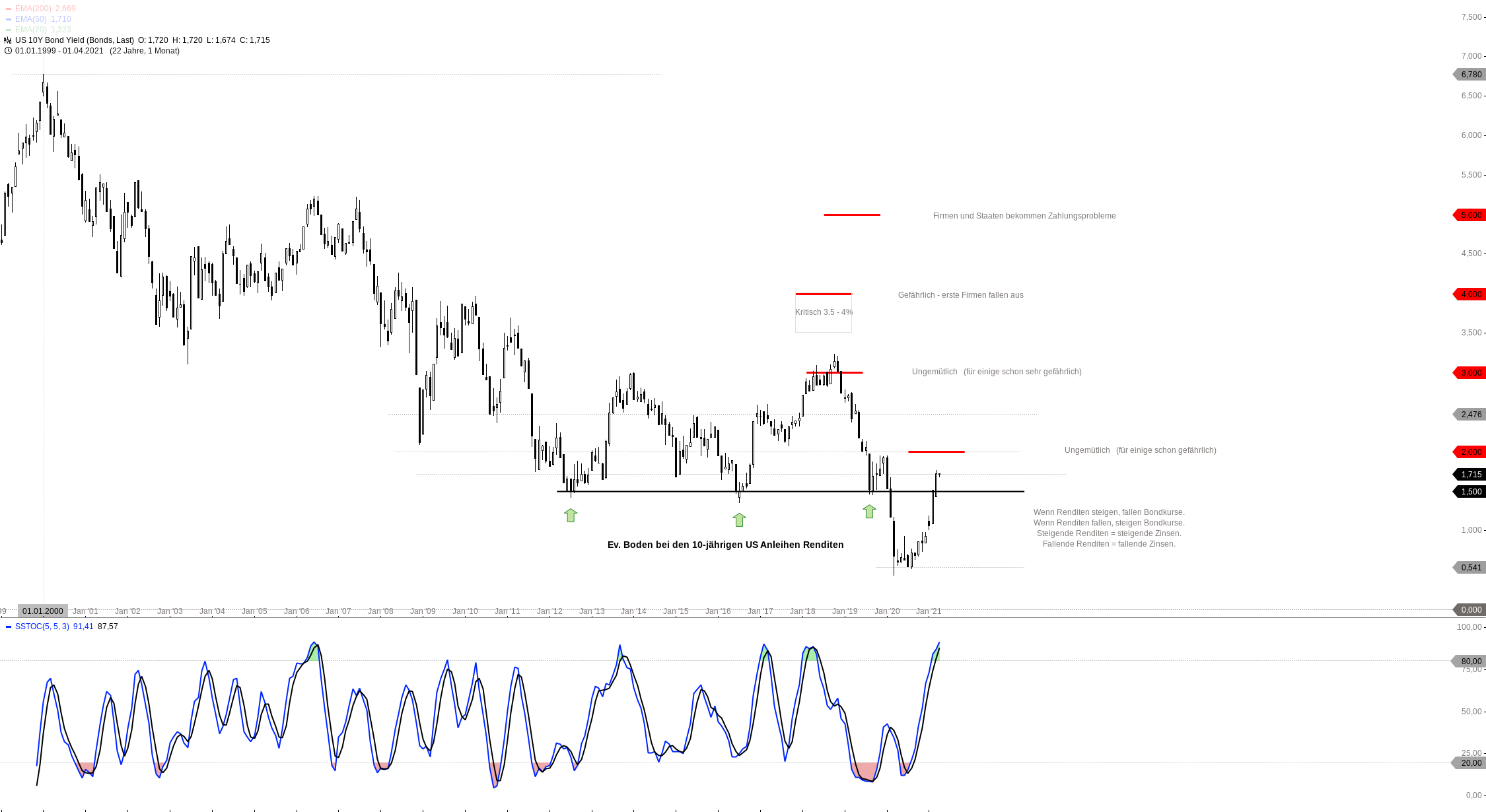Monatschart US 10Y Bond Yield – Renditen auf 10-jährige US-Staatsanleihen – 1999 – 2020, eine Kerze entspricht einem Monat / Logarithmisch – Chart by Guidants