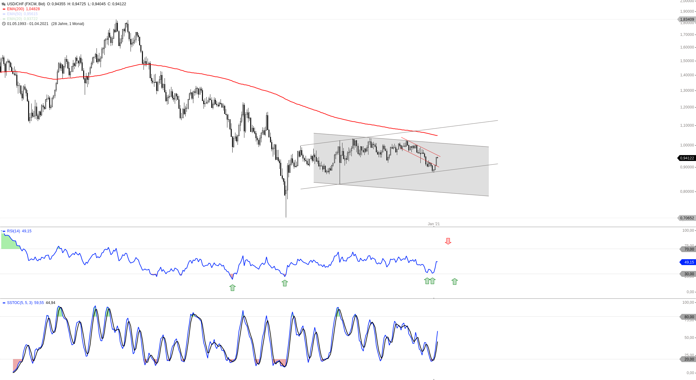 Monatschart USD_CHF 1992 – 2021, eine Kerze entspricht einem Monat / Logarithmisch – Chart by Guidants
