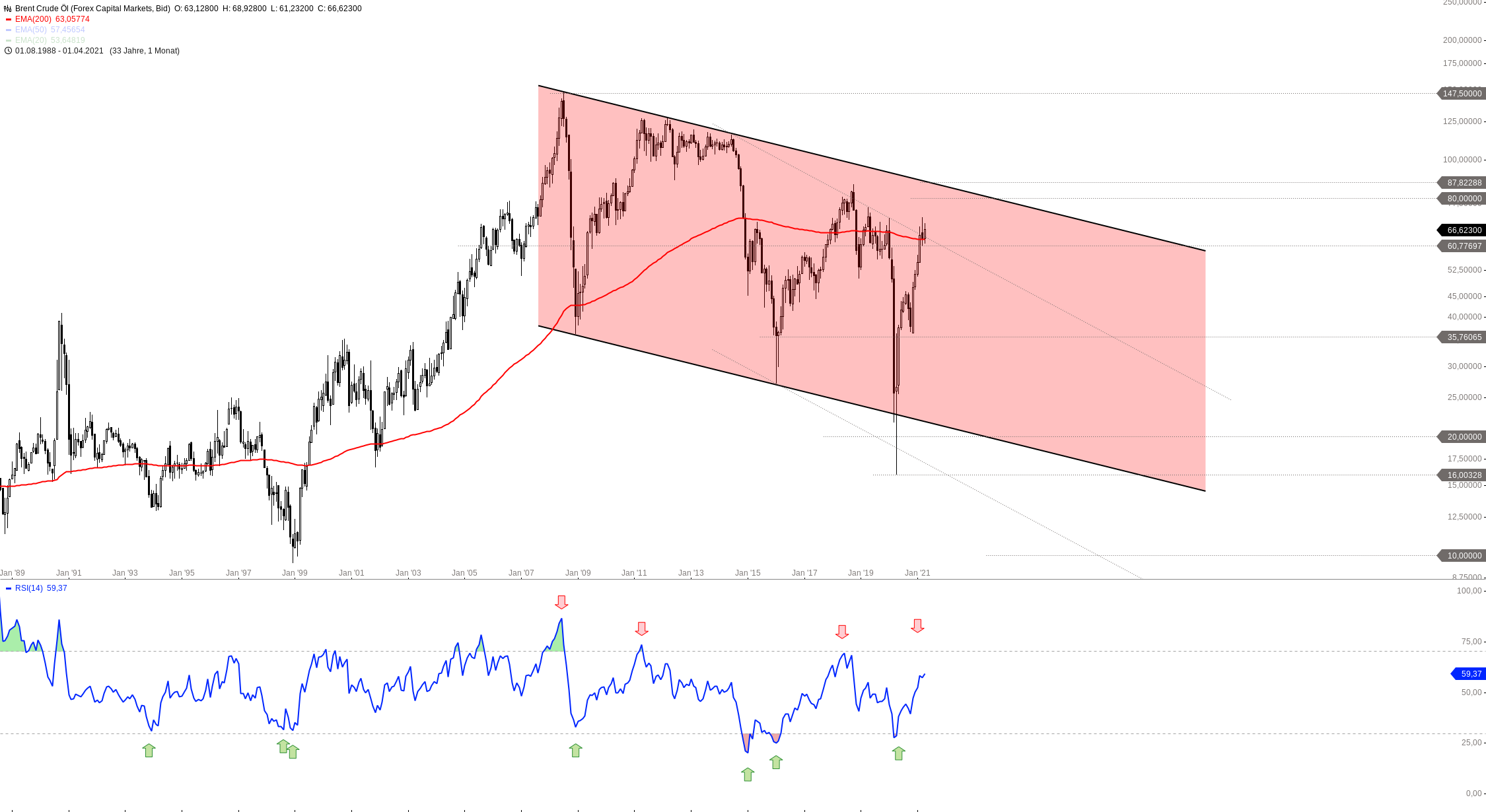 Monatschart Brent Crude Oil 1988 – 2021, eine Kerze entspricht einem Monat / Logarithmisch – Chart by Guidants.