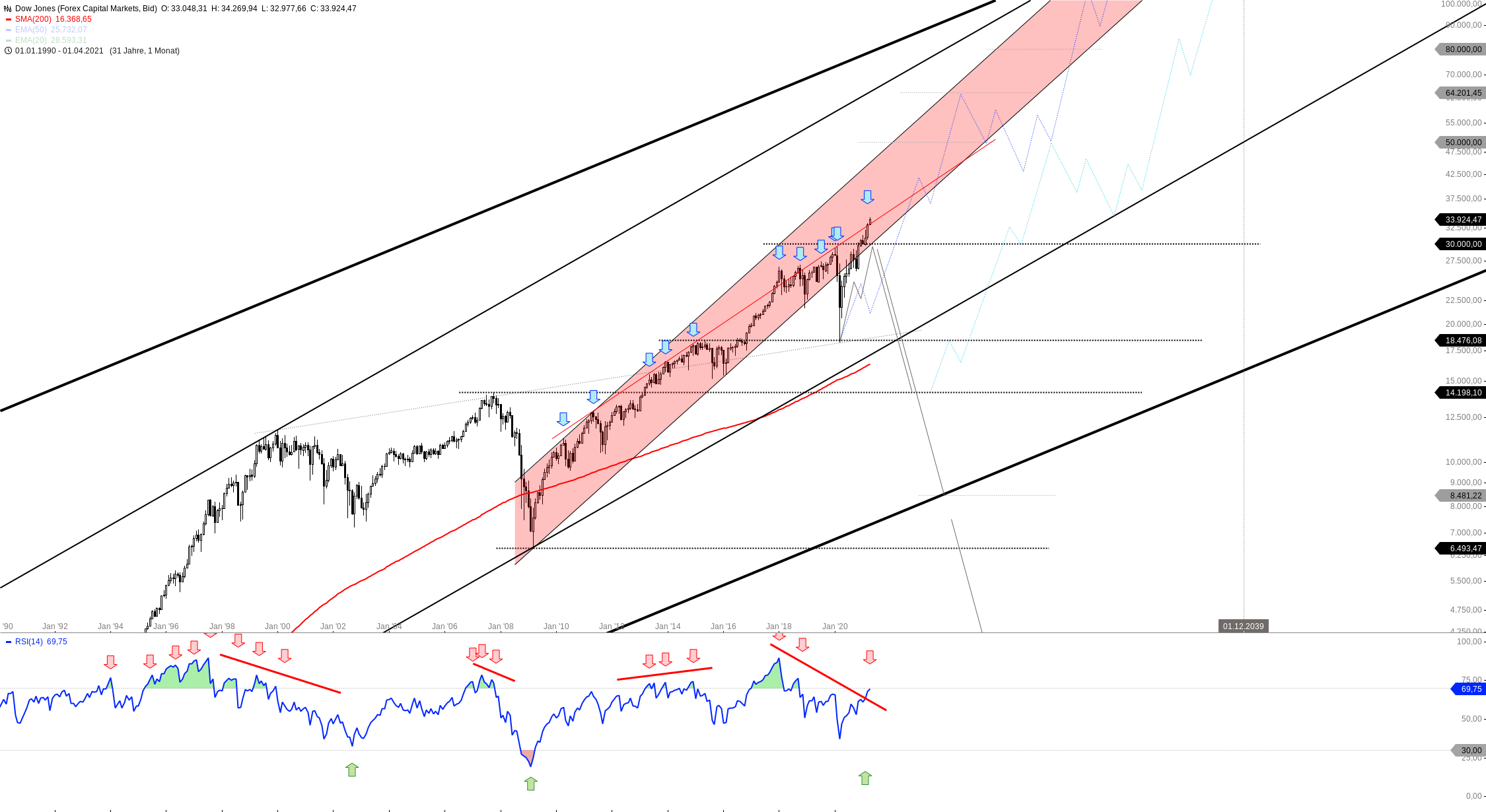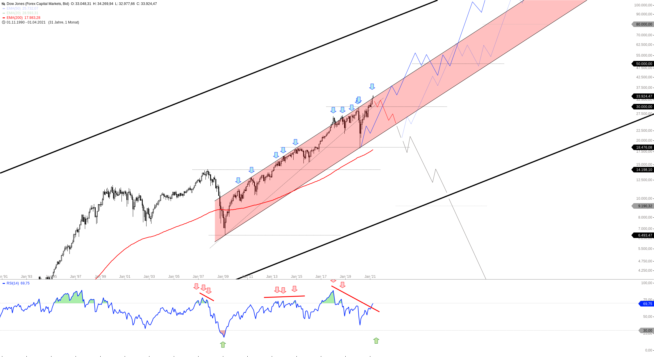 Monatschart Dow Jones Index 1990 – 2021, eine Kerze entspricht einem Monat / Logarithmisch – Chart by Guidants.
