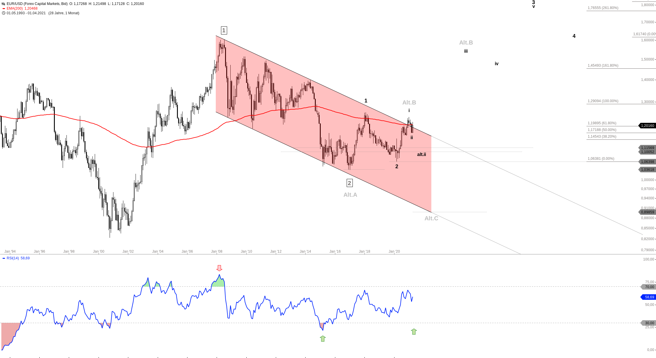 Monatschart EUR_USD 1993 – 2021, eine Kerze entspricht einem Monat / Logarithmisch – Chart by Guidants.