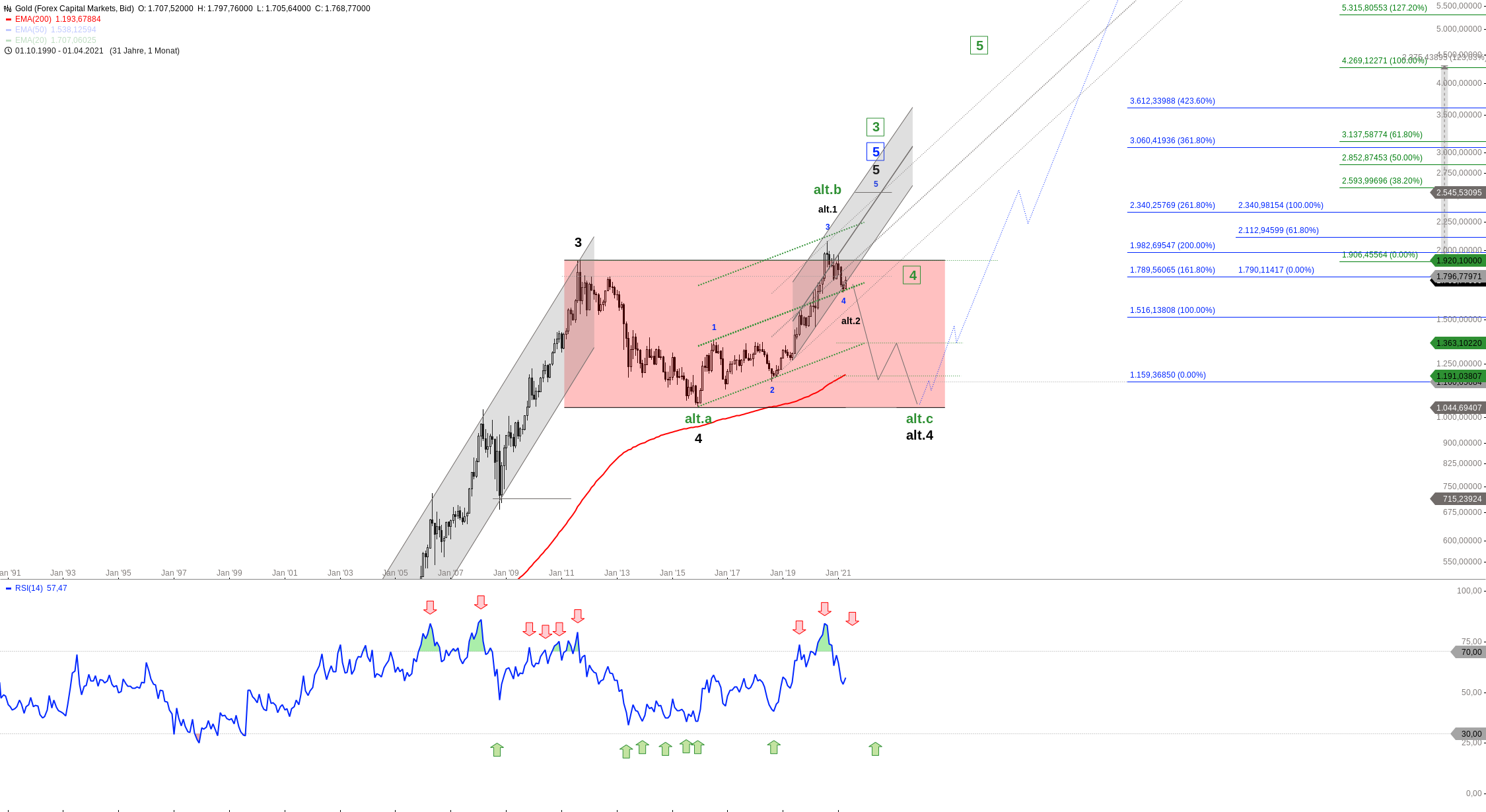 Monatschart Gold 1991 – 2021, eine Kerze entspricht einem Monat / Logarithmisch – Chart by Guidants