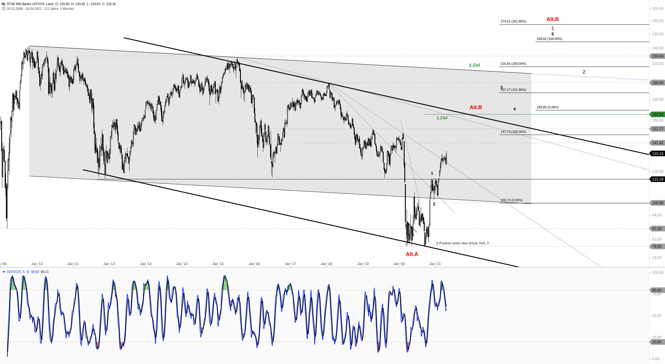 Wochenchart STXE 600 Bank Index Index Feb. 2009 – Deb. 2021, eine Kerze entspricht einer Woche / Logarithmisch – Chart by Guidants.