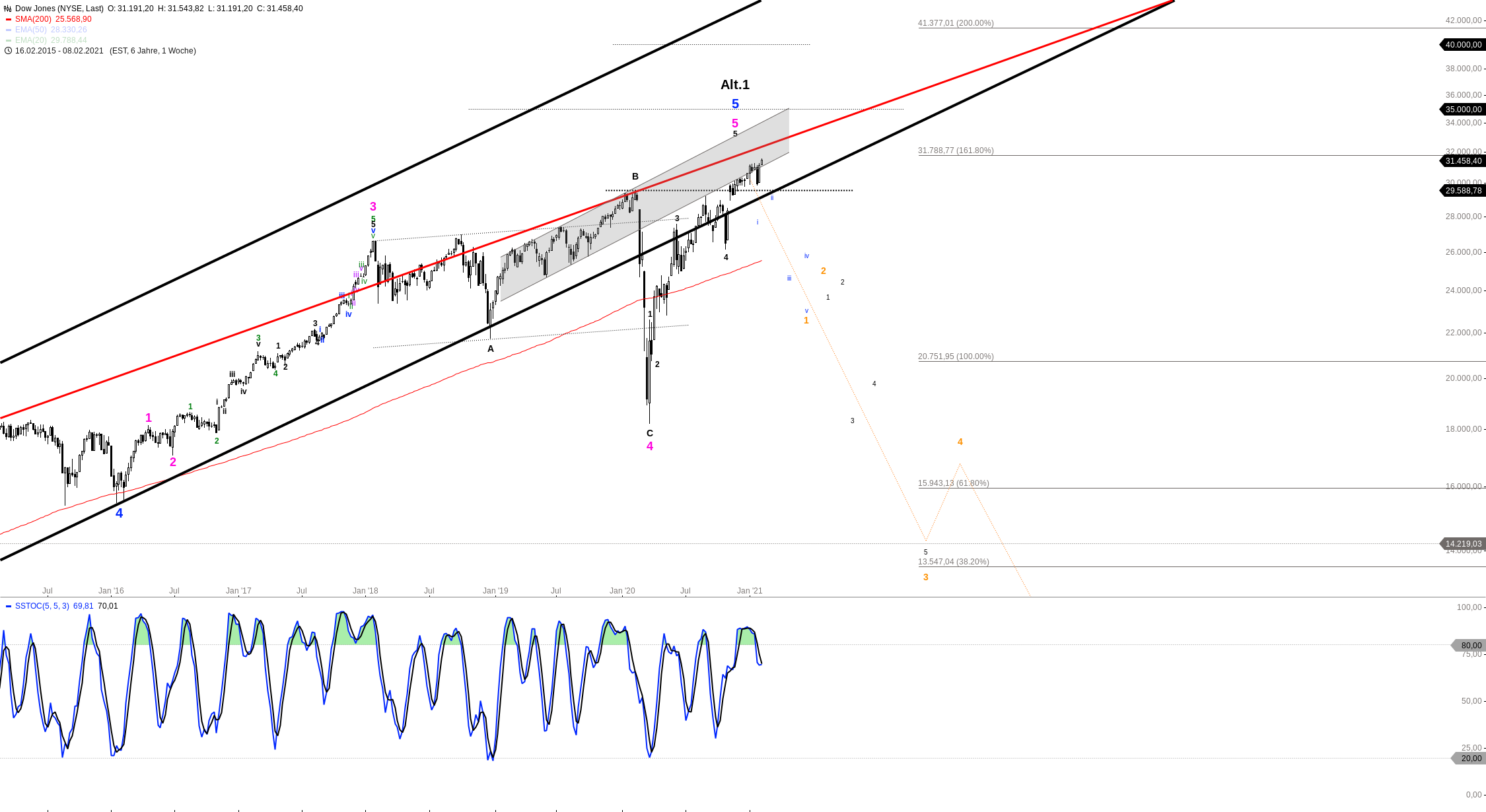 Wochenchart Dow Jones Index 2014 – 2021, eine Kerze entspricht einer Woche – Chart by Guidants.