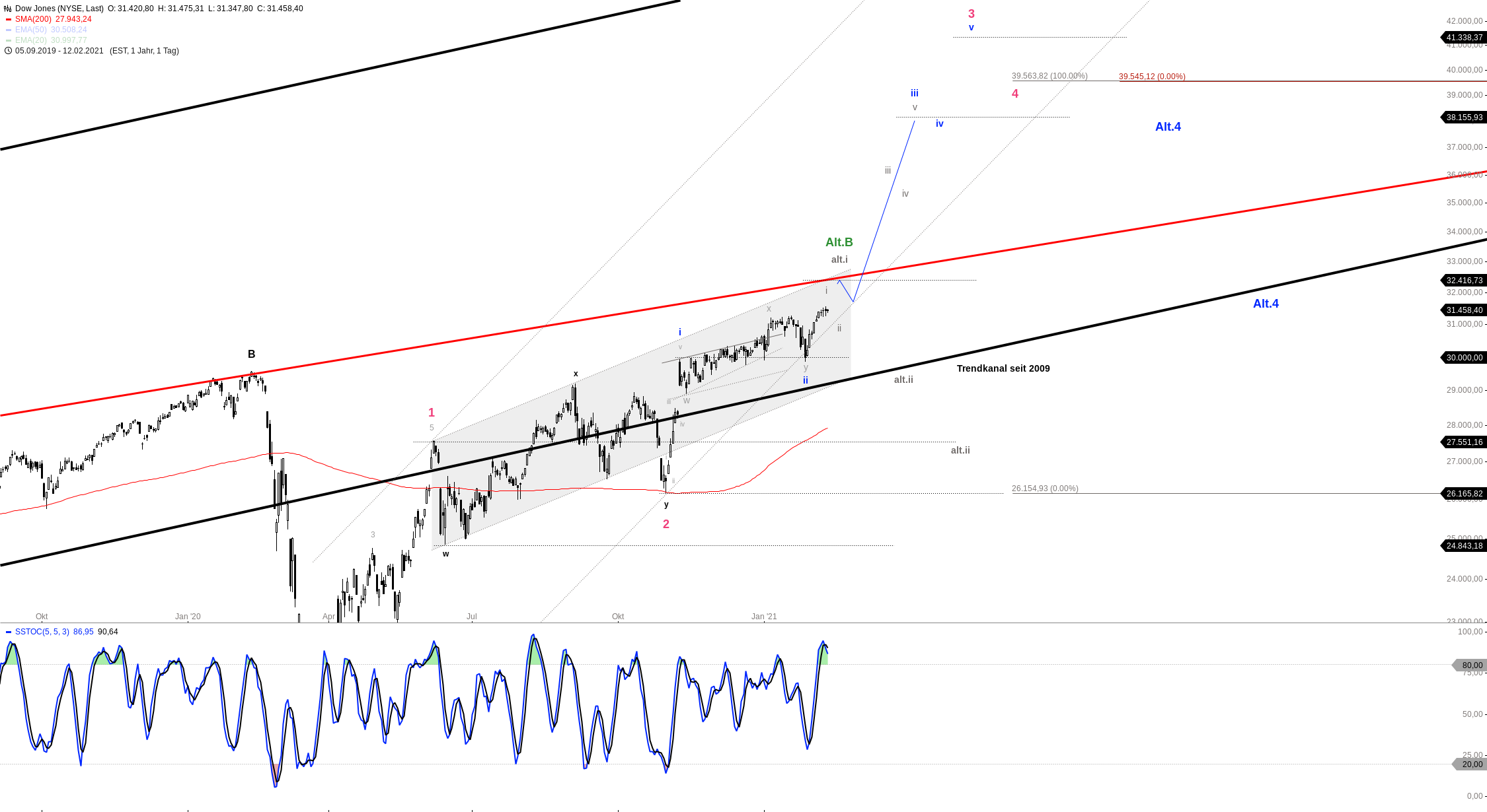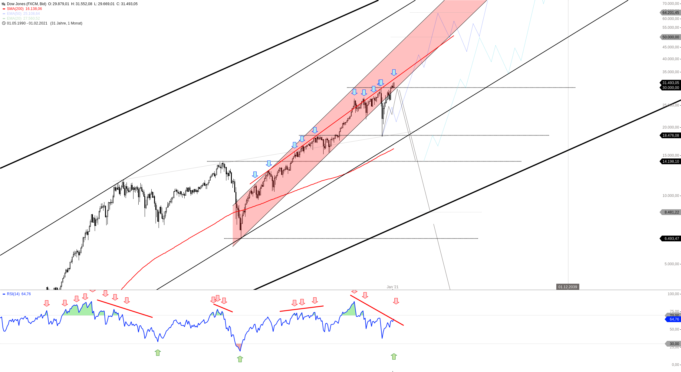 Es geht also zuerst nochmal ein Stück Richtung 30’900, 30’000, oder sogar 27’500 Punkte nach unten und erst danach kommt der Angriff auf die rote Linie.