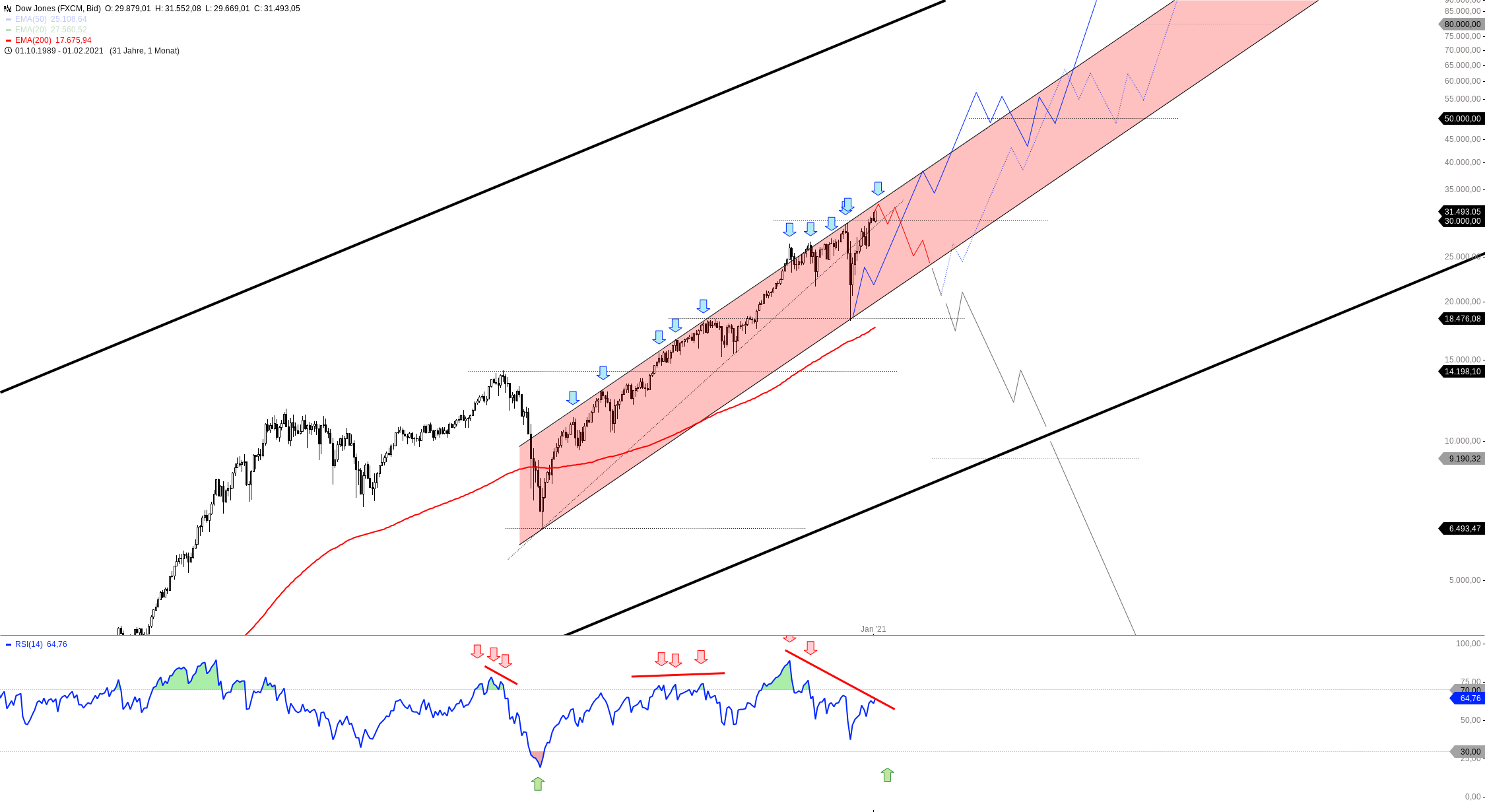 Monatschart Dow Jones Index 1990 – 2021, eine Kerze entspricht einem Monat – Chart by Guidants.