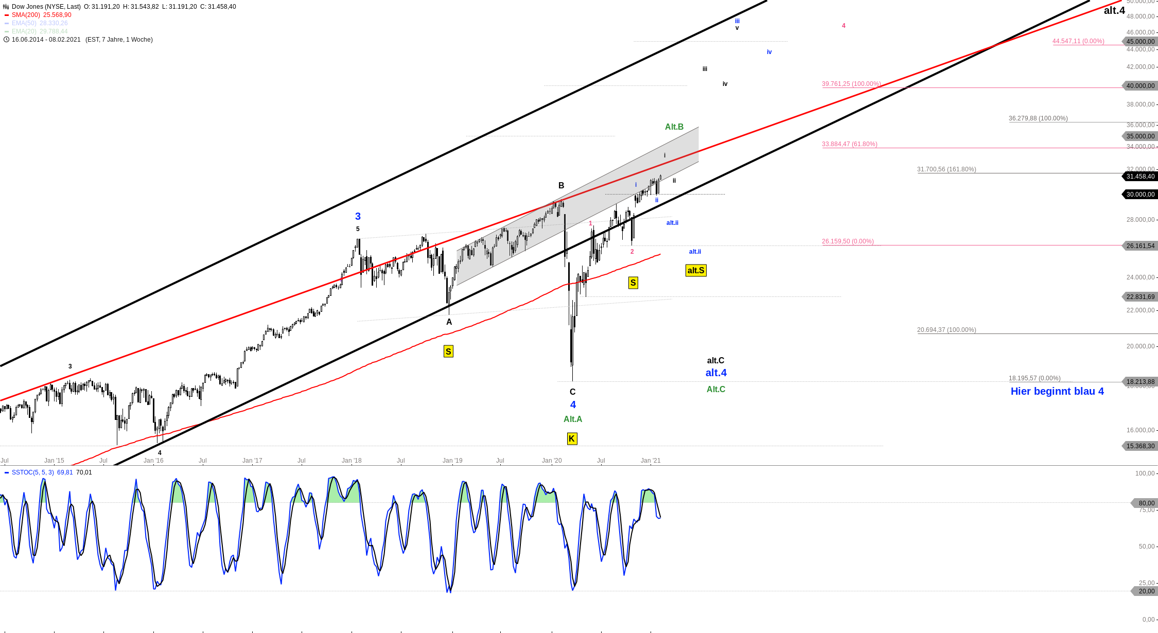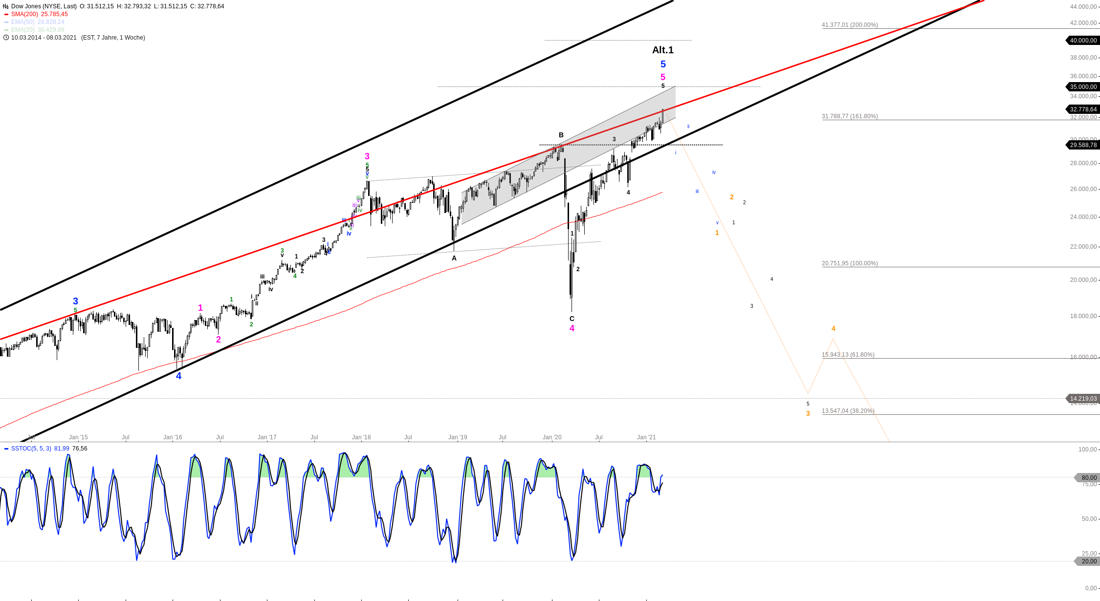 Wochenchart Dow Jones Index 2014 – 2021, eine Kerze entspricht einer Woche – Chart by Guidants.
