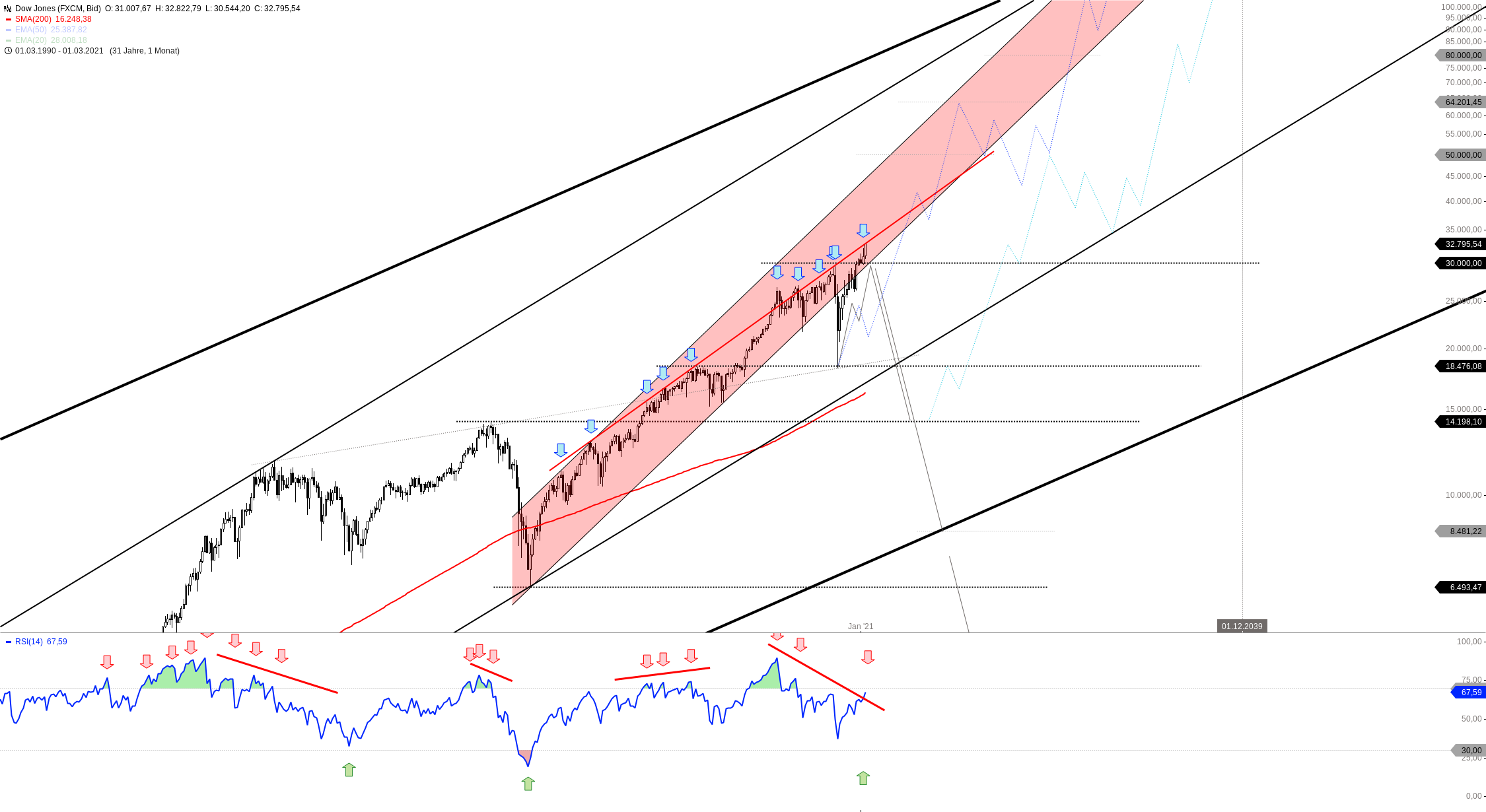 Monatschart Dow Jones Index 1990 – 2021, eine Kerze entspricht einem Monat – Chart by Guidants.